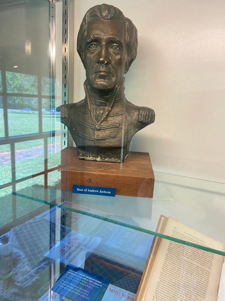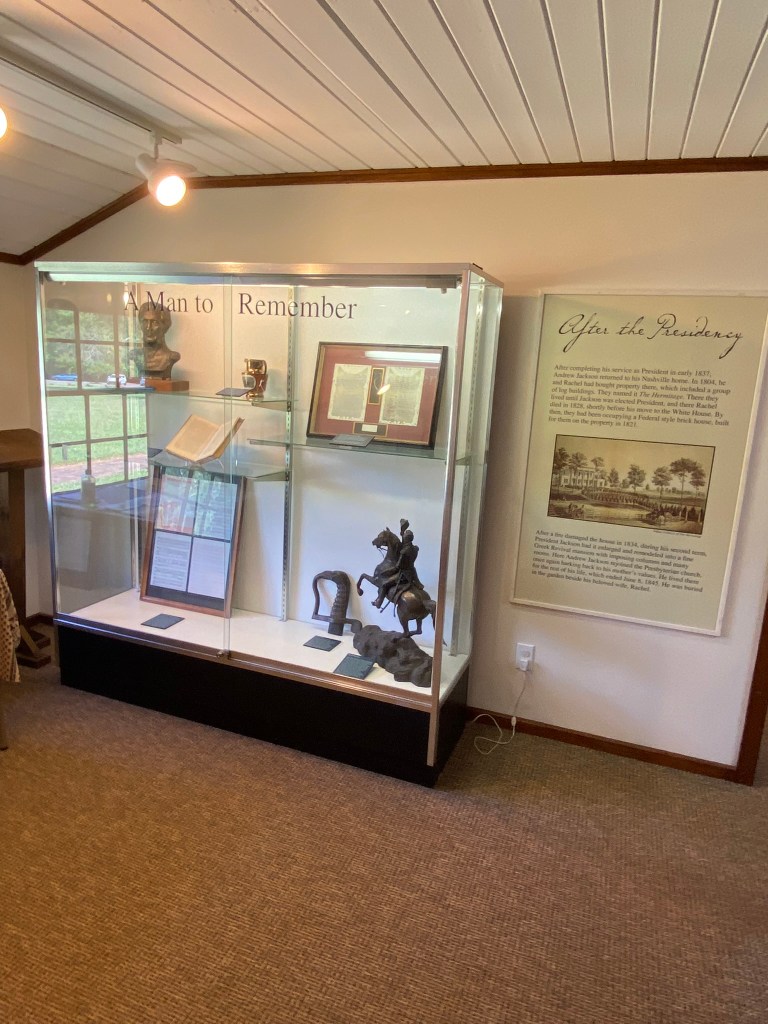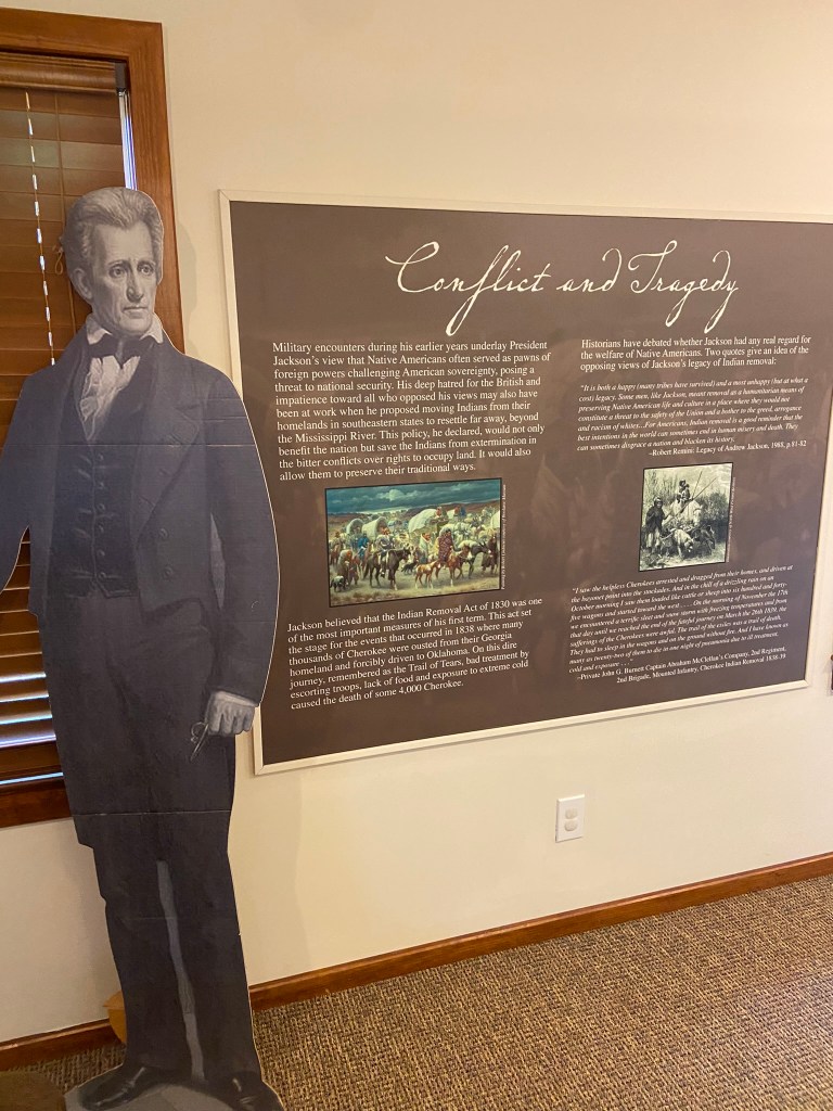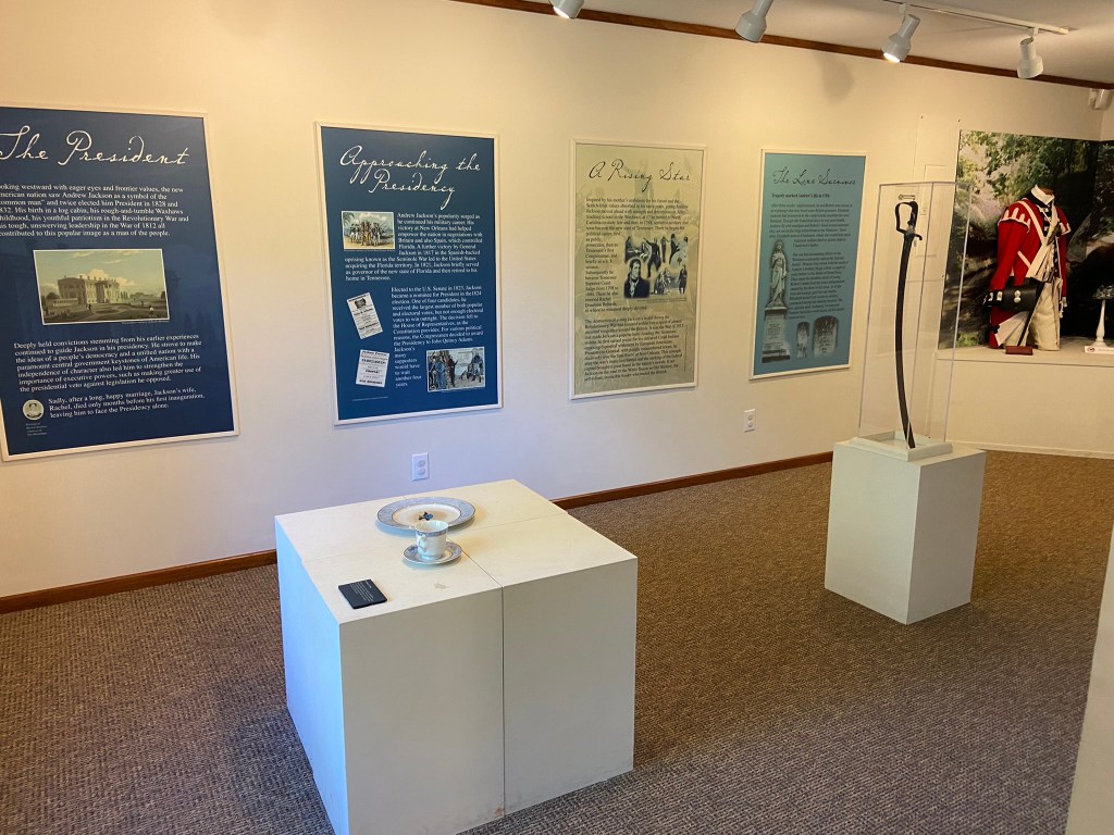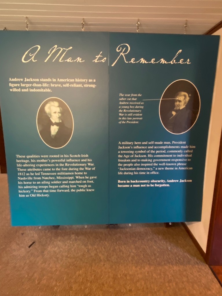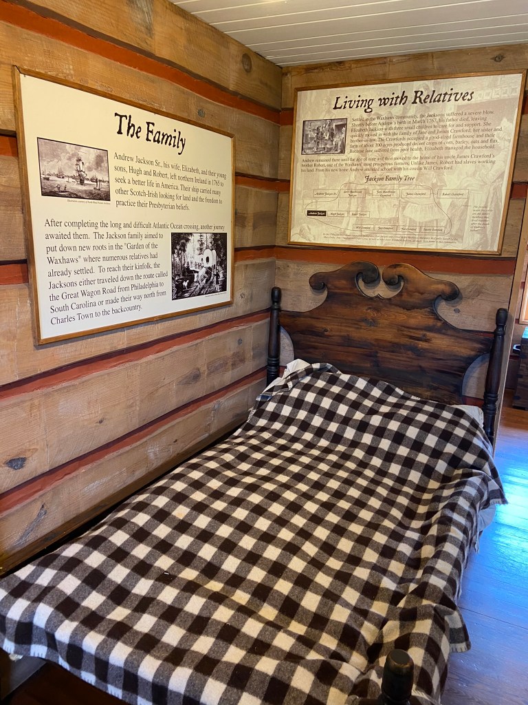 In the museum On the WaxhawsAndrew Jackson historyAndrew Jackson: Conflict and TragedyPost-PresidencyJackson bust Andrew JacksonGreat displays Replica kitchenCabin life WaxhawsGift shop Young Andrew refusing to wipe British boots. Andrew Jackson birthplace…but in which state?