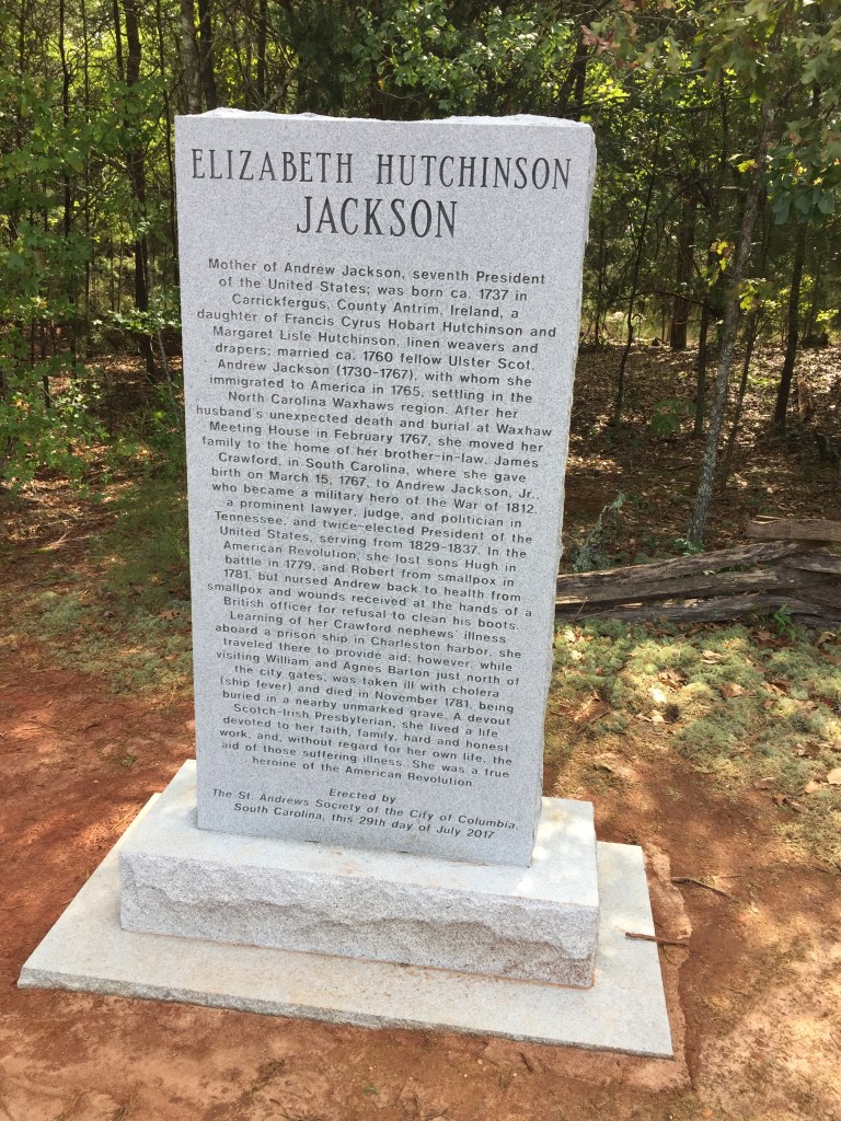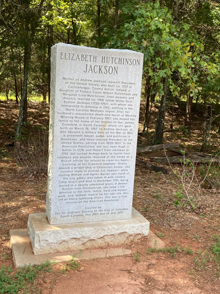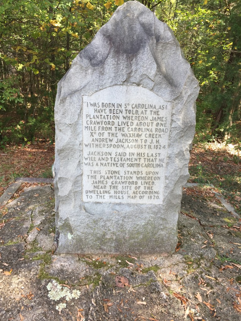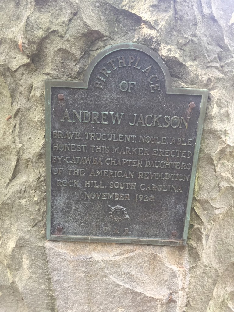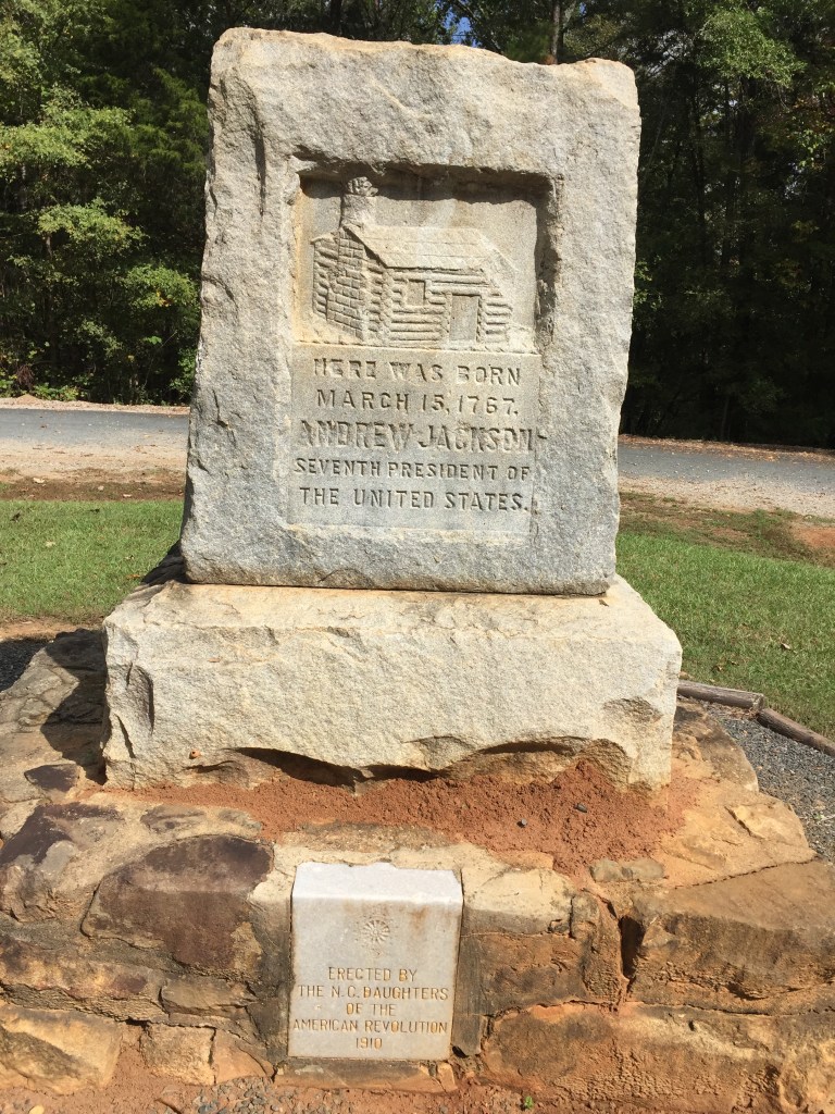 Re-Visiting Andrew Jackson’s South Carolina birthplace!The grove of birthplace monumentsAndrew Jackson’s words about his South Carolina birthTribute to Andrew’s mother! Andrew on horsebackLast South Carolina tributeAt the North Carolina commemoration. See the discoloration midway? Re-Visiting Jackson’s North Carolina Birthplace