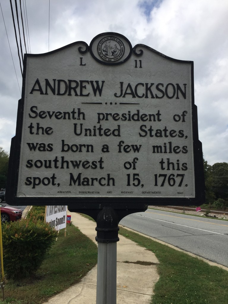 Marker in Waxhaws (NC).South Carolina marker outside the state park.“Truculent” memorial in the Andrew Jackson State Park in South Carolina. With the South Carolina birthplace memorial. Memorial for Andrew’s mother, Elizabeth.Memorializing Jackson’s own writings about his birth, in South Carolina.Marker and statue of Andrew Jackson in South Carolina. With the statue.Young Andrew on horseback.The North Carolina memorial, just across the state border.With the North Carolina birthplace marker.