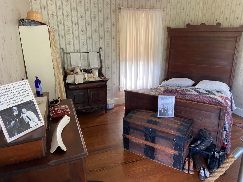 At the Eisenhower birthplace!Dwight Eisenhower birthplaceThe bedroom where Dwight was bornIn the bedroomLiving room KitchenMarker in front of the birthplaceStatue of Dwight Eisenhower besideWith the bust of Dwight Eisenhower in the visitor center