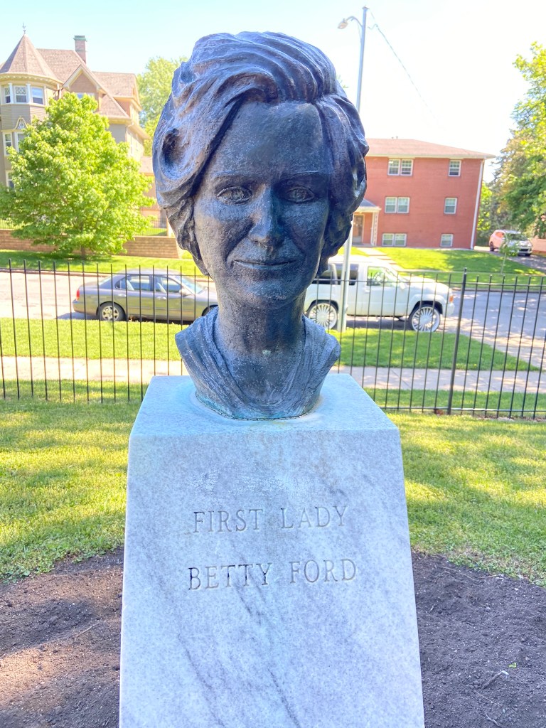 At the Gerald Ford Birthplace!Birthplace MarkerList of Presidents and their birth statesBirthplace tabletsBust of Gerald Ford in the rose gardenWith Betty Gerald Twinning with Gerald Birthplace replica in the kioskSome items from inside the kioskGerald in his snapper poseI had to!Gerald and meYou can make out the layout of the home The layout of the memorial gardenGerald and me