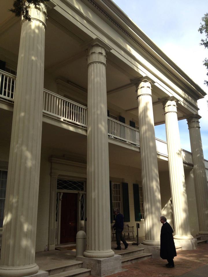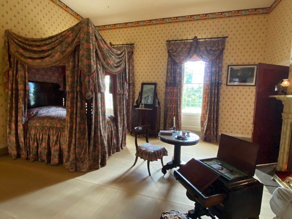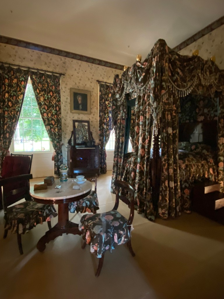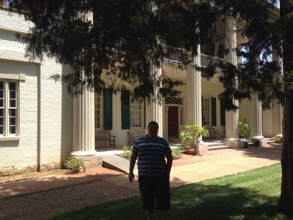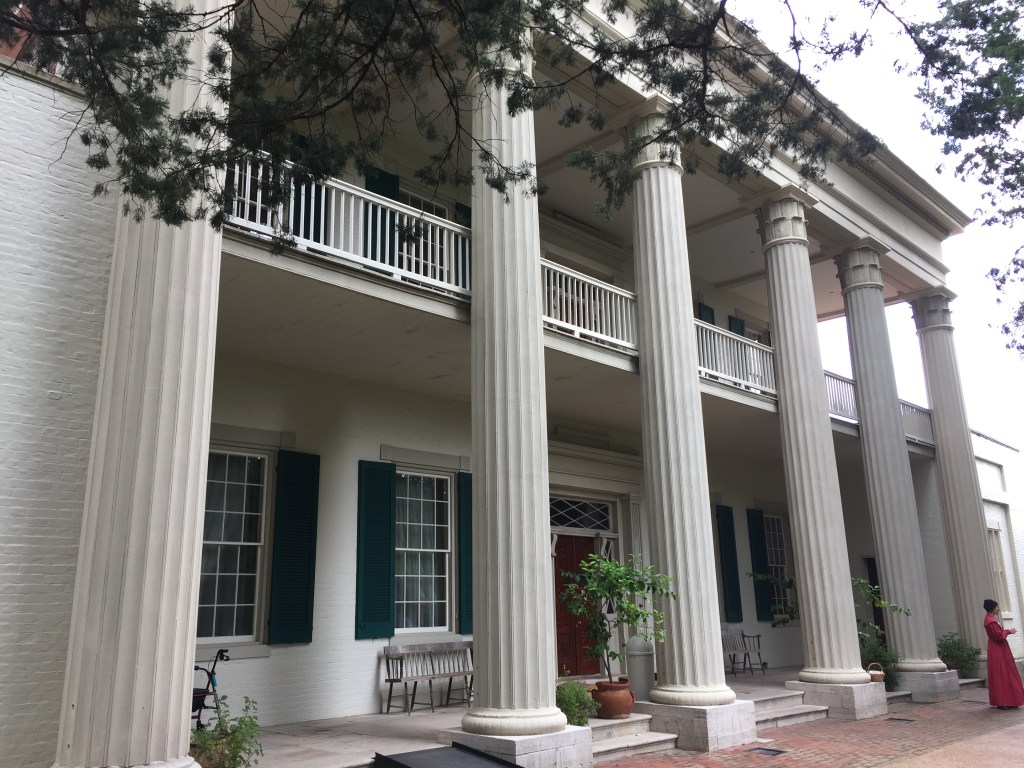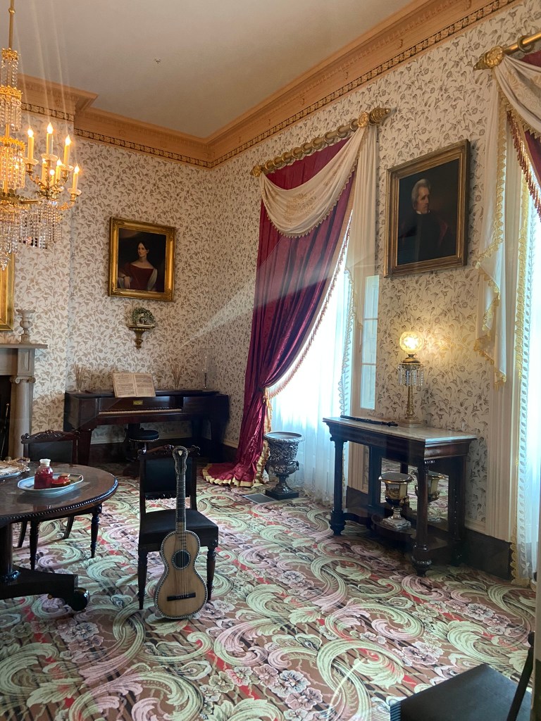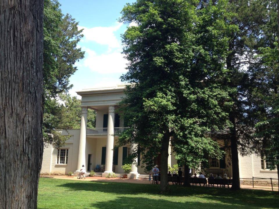 Andrew Jackson’s Hermitage!The HermitageFrom the approachThe breath-taking Entrance HallDetails on the wallpaper From the sitting roomSumptuous furnishingsIn the sitting roomAndrew Jackson’s parlorEntranceAndrew Jr’s roomGeneral and Mrs. Jackson’s bedroomAndrew Jackson’s office Heading upstairsThe yard from the balconyOn Andrew Jackson’s balcony Andrew Jackson’s balcony Guest roomThe dining room The back of the homeBack of the house: very different from the frontAndrew Jackson’s gardenIn the flowersAndrew and me!The Hermitage (with baby trees!), from the official site.