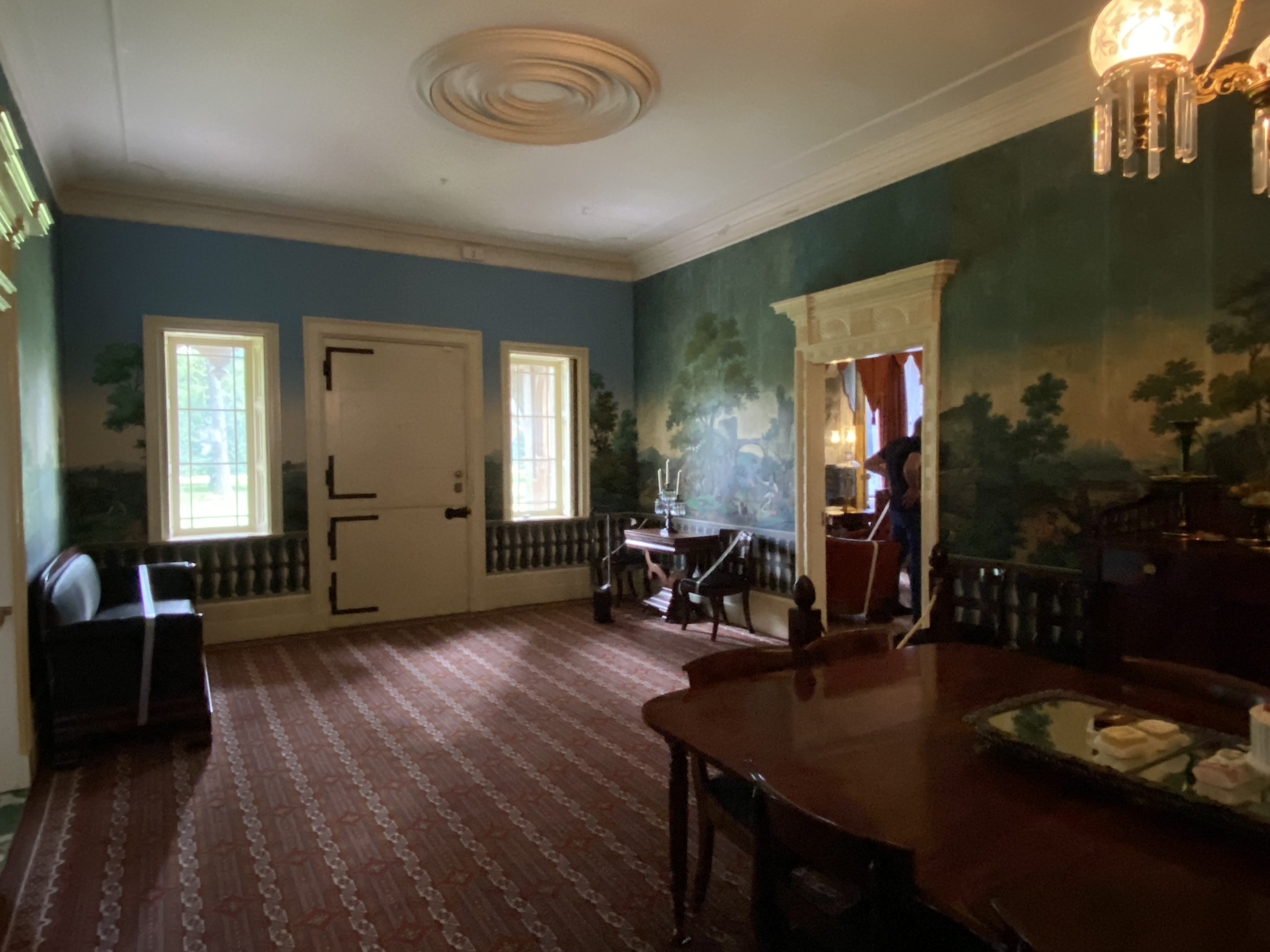 Lindenwald!Martin Van Buren’s Lindenwald waysideFrom the side!The Entrance Hall-Dining Room with the dramatic wall paper. Lindenwald, with and without the portico.Hannah and Martin Van Buren, from FirstLadies.com and White House Historical Association.
