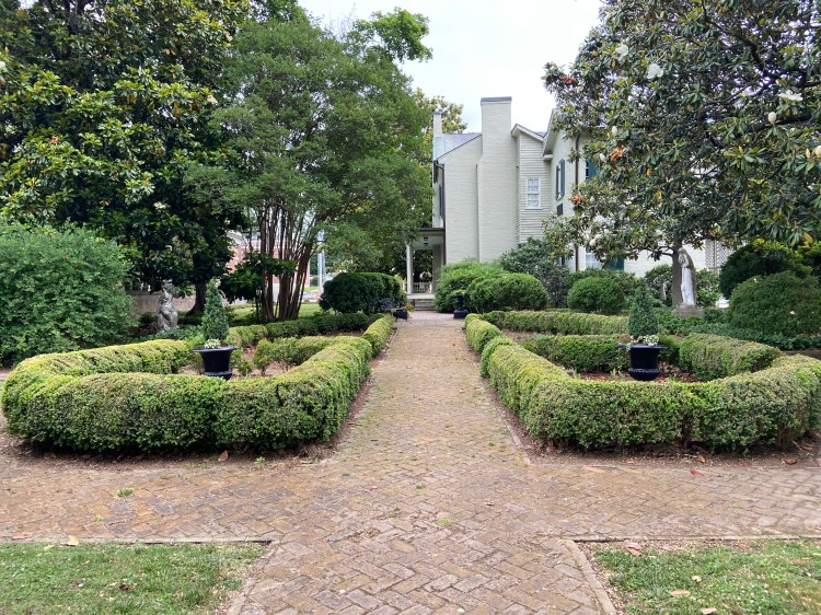 At the Polk Home in Columbia. From the outside. With the sign. At the museum for the Polk Home. Information on Polk Birthplace. Sarah’s display. Polk poster. Information on the Polk White House. The Polk White House mantel. Heading in the Polk House. Entrance Hall and Staircase. Formal Parlor. Portraits in the Parlor. Polk Portrait. Sarah Childress Polk. I LOVE this table! Dining room. Sitting chair in the upper study. Bookcase with Polk’s own books. Love the desk. Kitchen. Rose garden. In the garden. James and me.Polk Home in Columbia, Tennessee.
