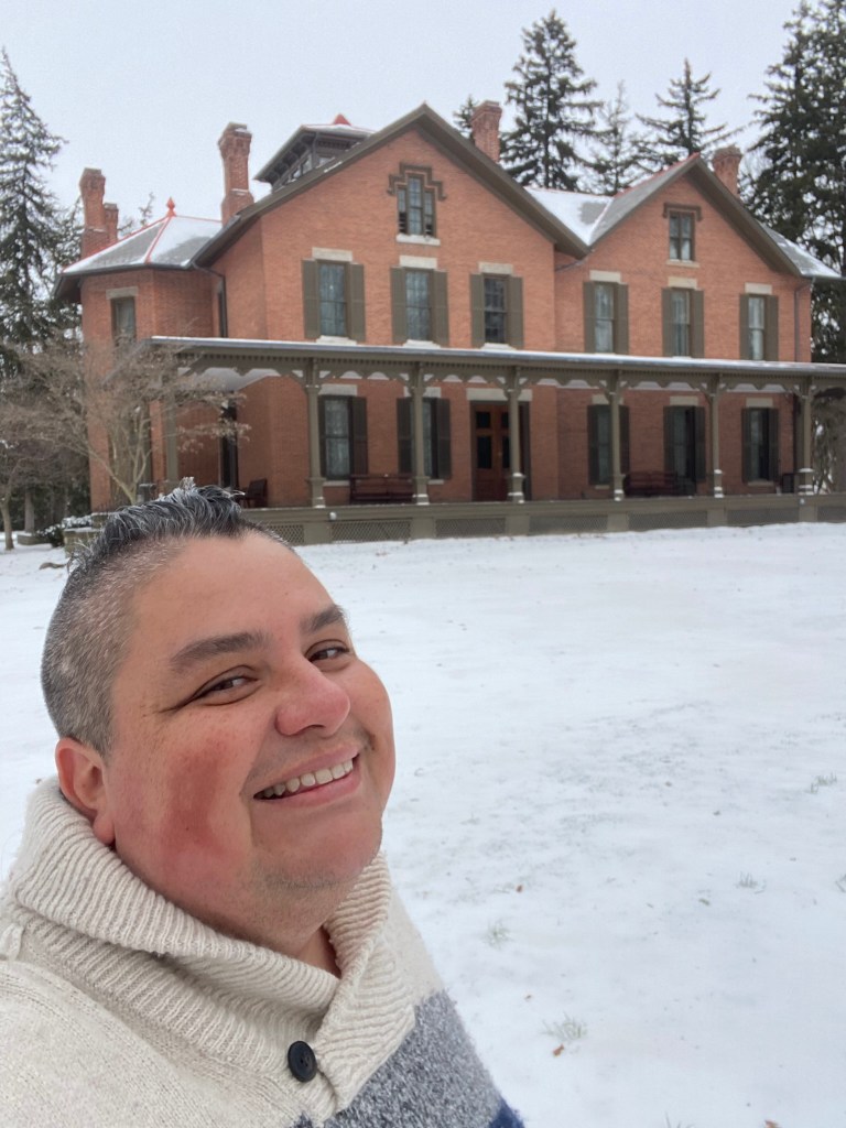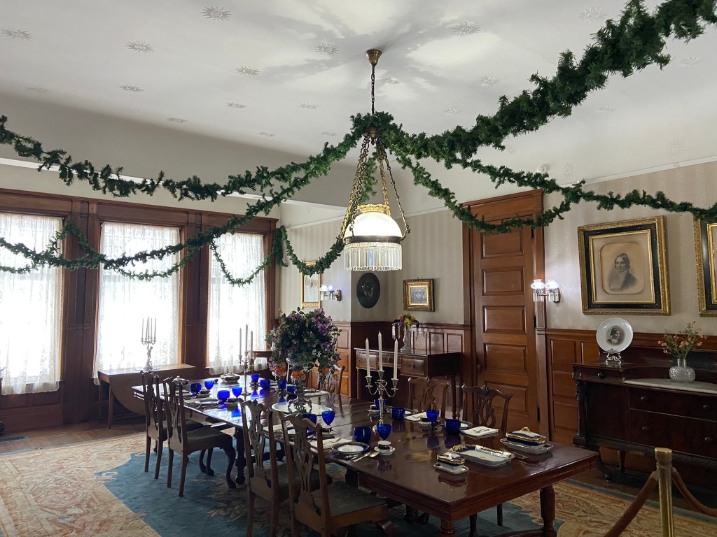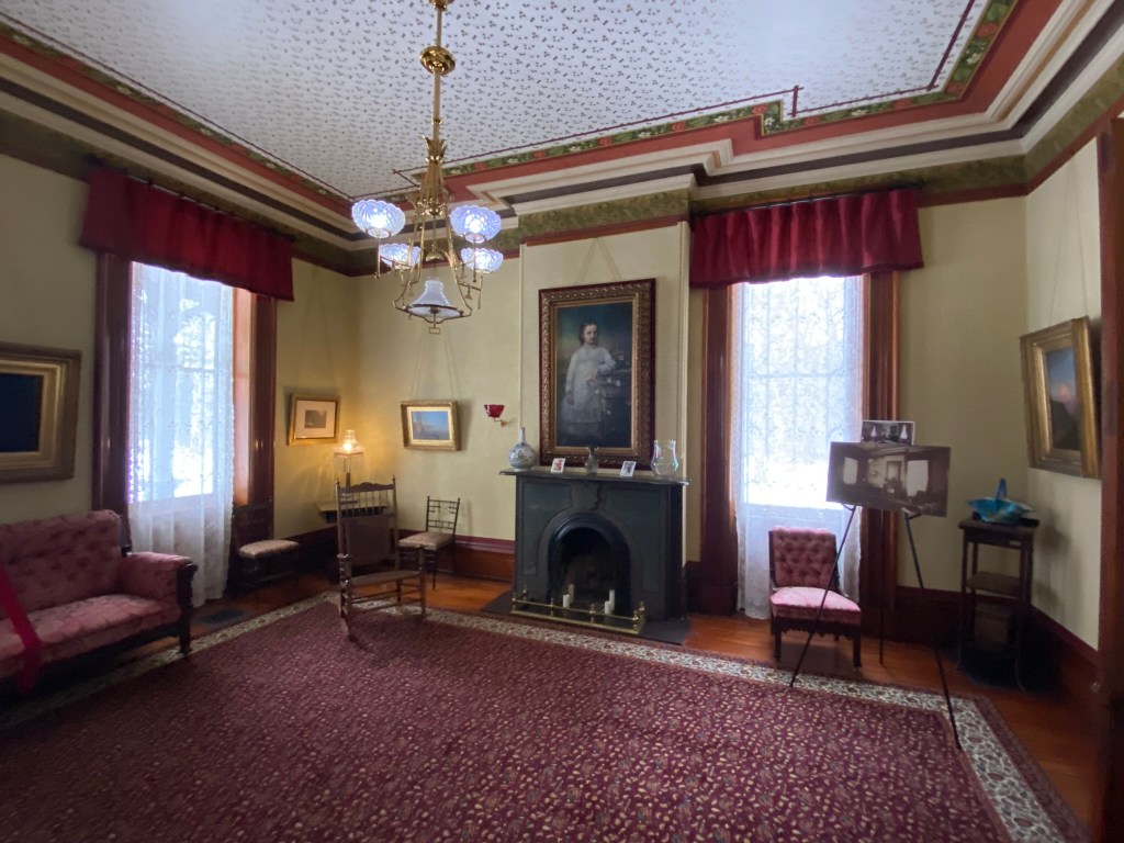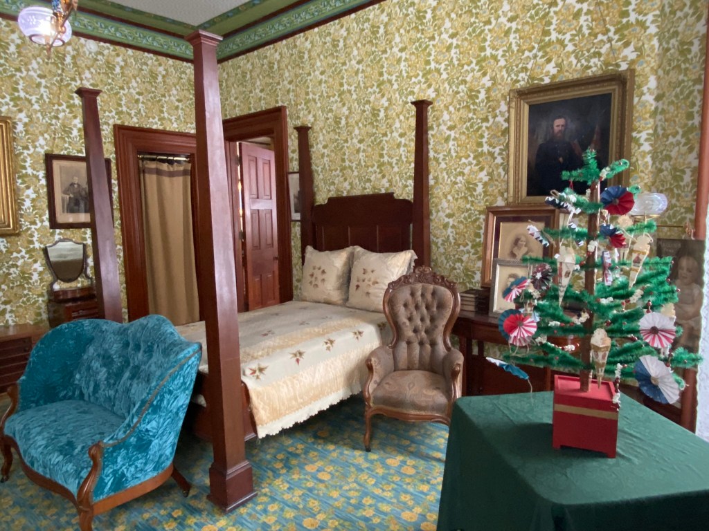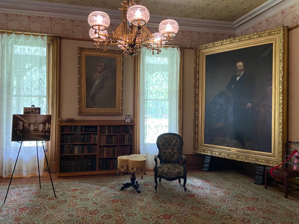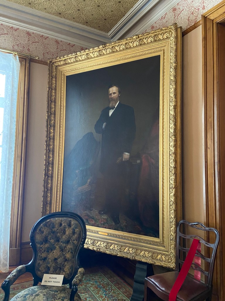 With the HayesesSpiegel Grove in winterEntrance HallRed Room Hayes bedroom with little treeHayes’ sanctumLooking up In the parlorRutherford’s portraitGorgeous parlor viewIn Rutherford Hayes’ parlorLibraryDining room Looking down on the entrance from the stairs Heading out! Formal entranceSpiegel Grove!