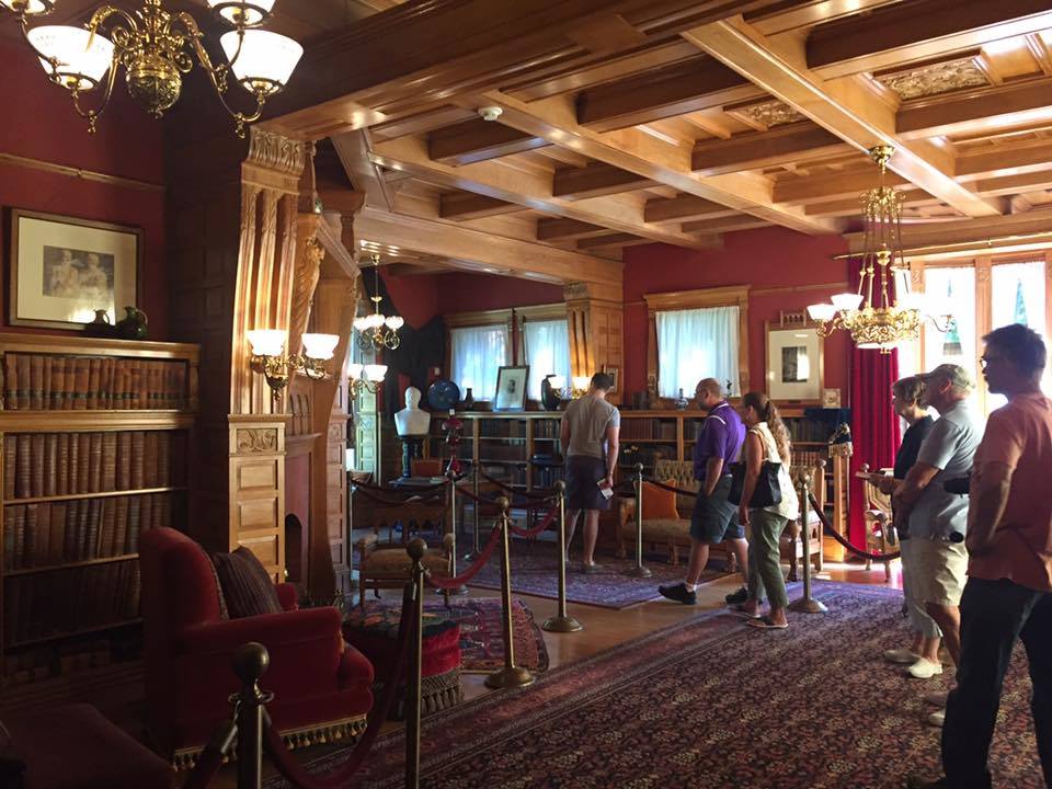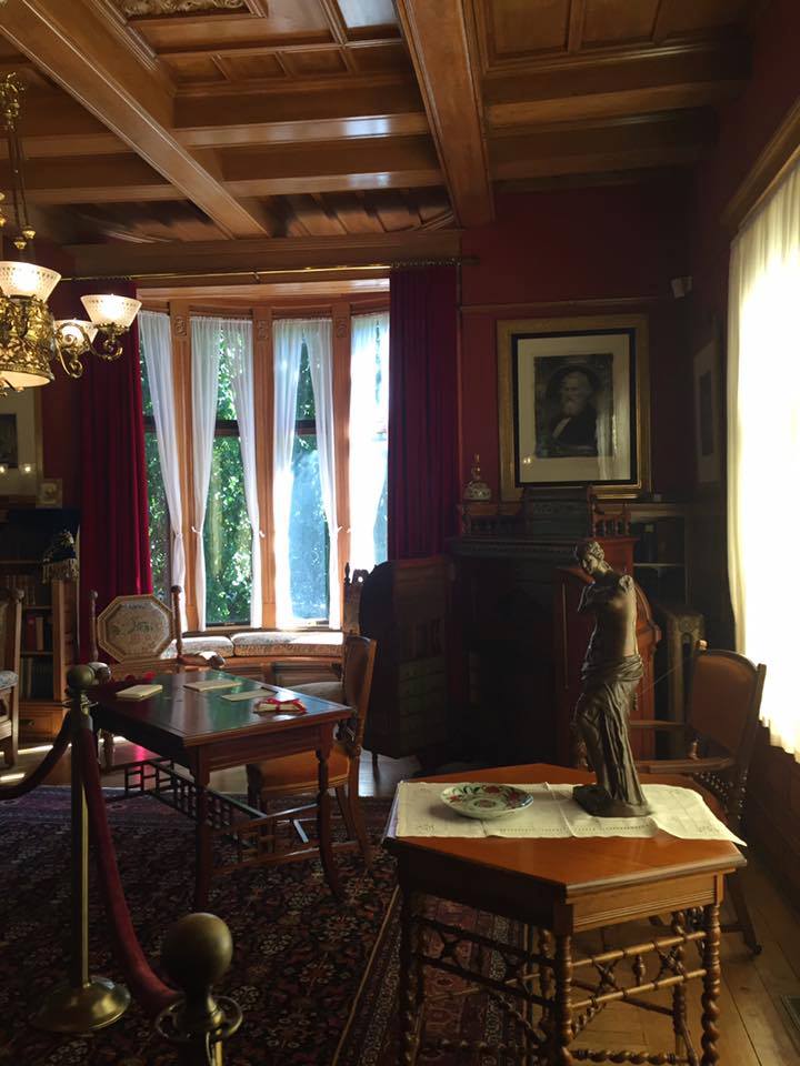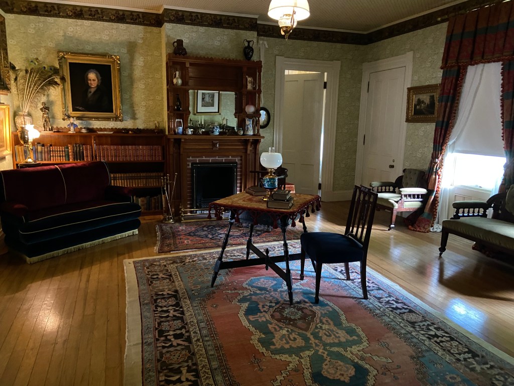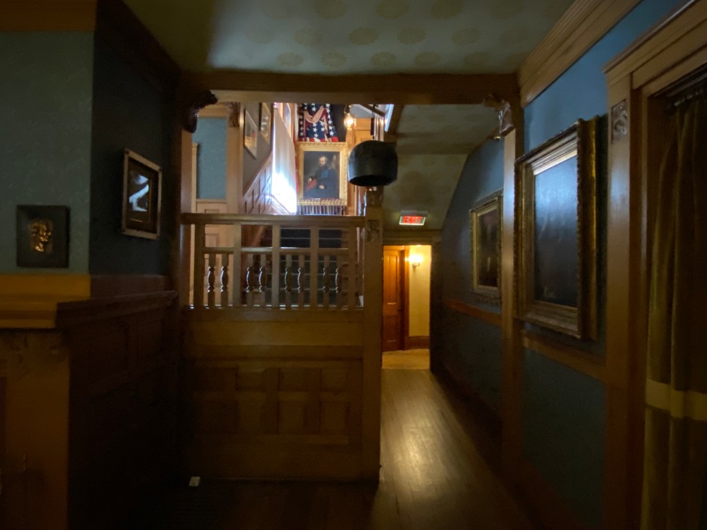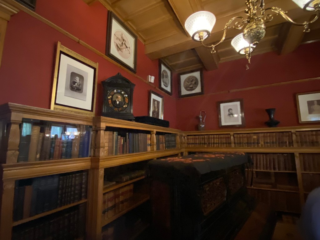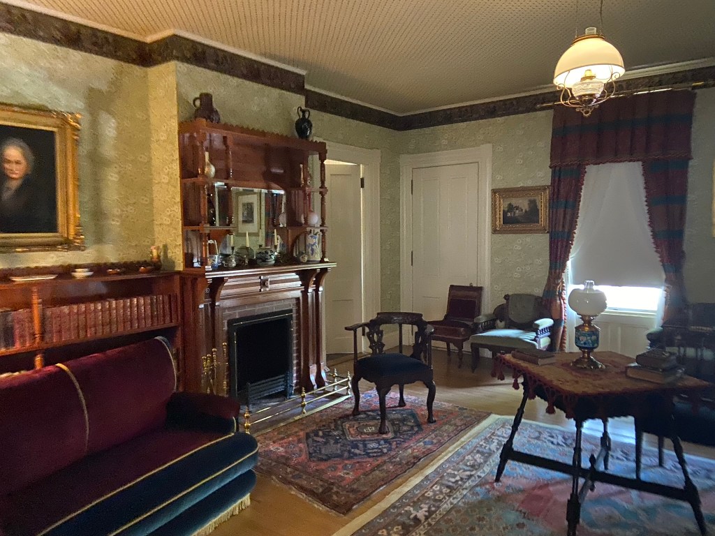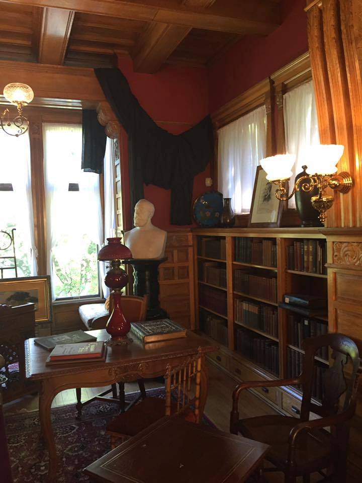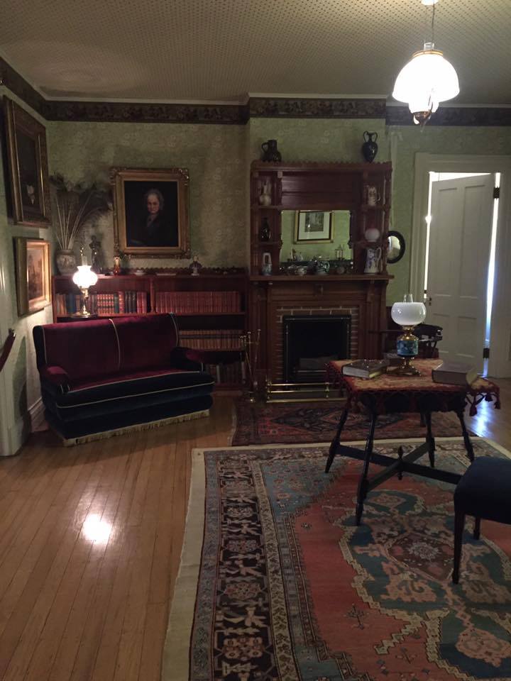 Gorgeous day at Lawnfield! LawnfieldMain entrance hallJames watching over the entranceEntrance hallFormal drawing room Dining room Plates and finery Heading up In the library Spider deskI love this room Library items In the vault Library selfie My favorite room Bedroom Mollie’s room James’ office From the front Lawnfield Love this angle, showing the joining of the differrent buildsProfile pic!