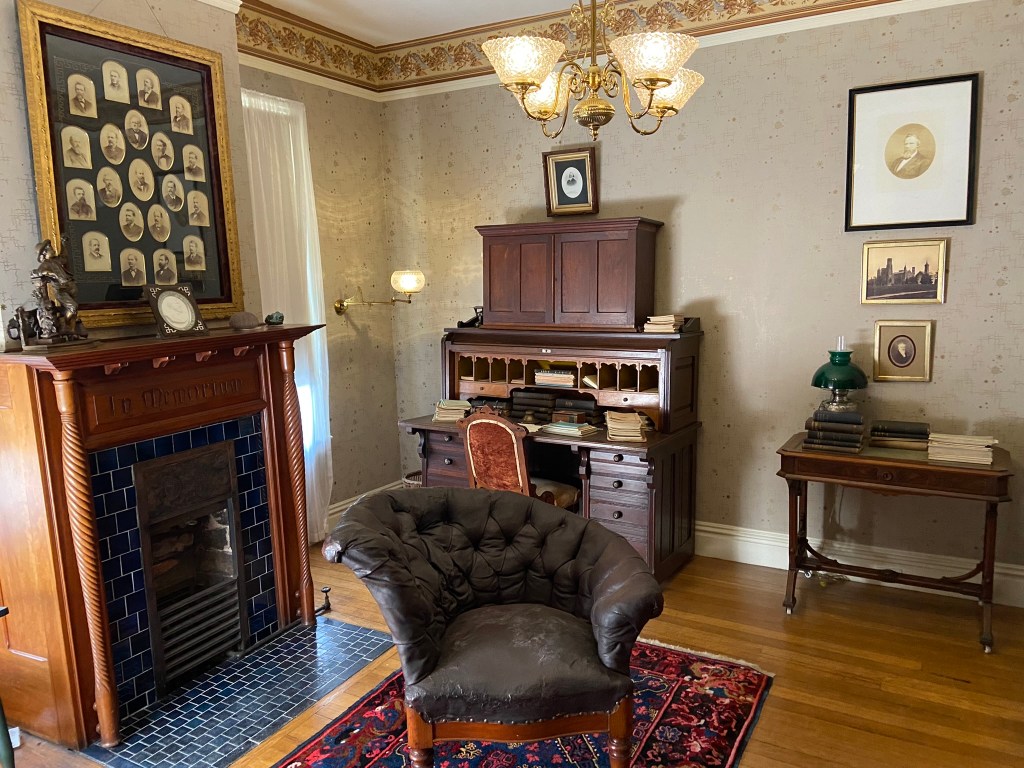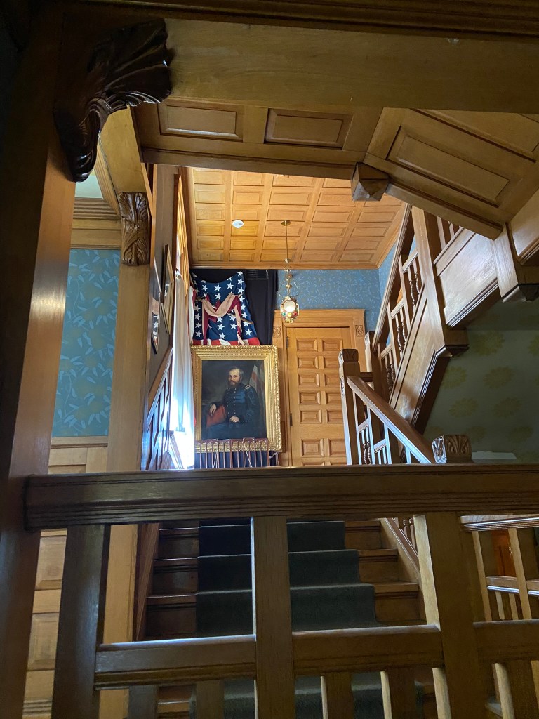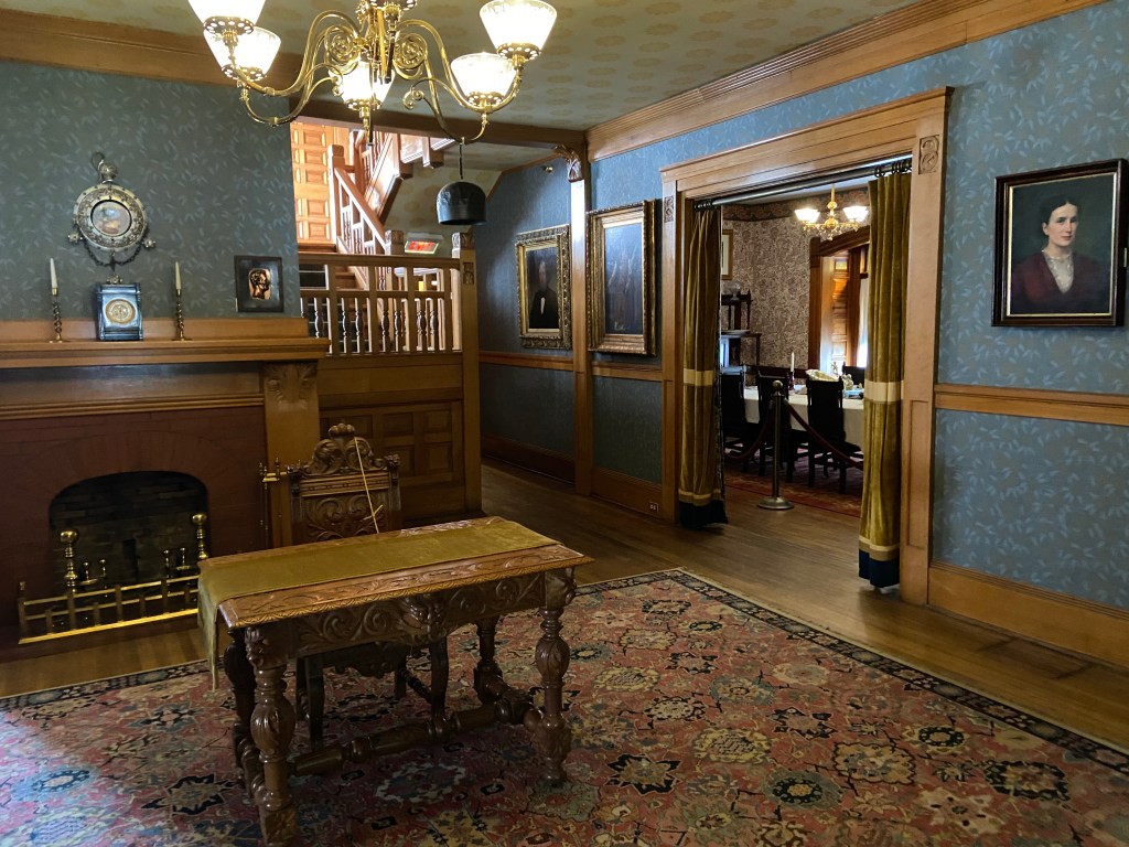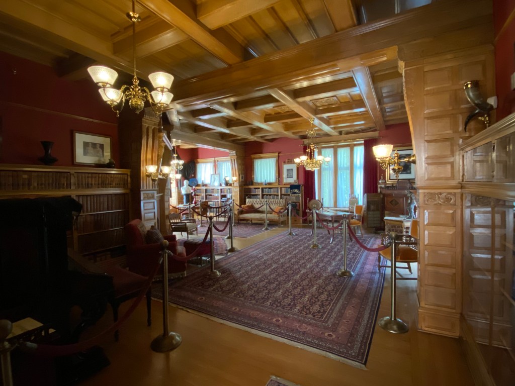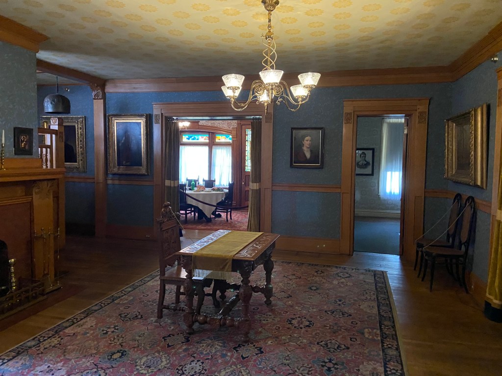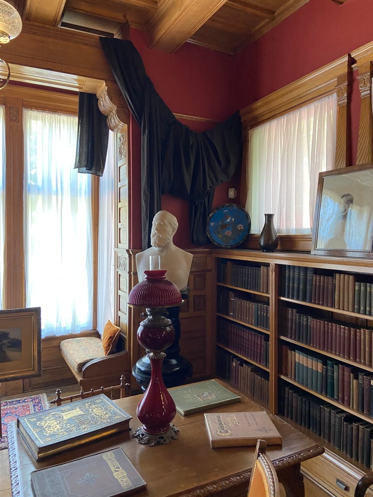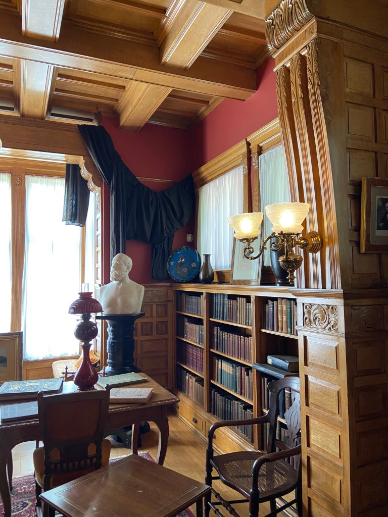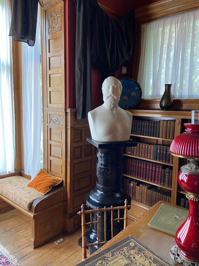 Gorgeous day at Lawnfield! LawnfieldMain entrance hallJames watching over the entranceEntrance hallFormal drawing room Dining room Plates and finery Heading up In the library Spider deskI love this room Library items In the vault Library selfie My favorite room Bedroom Mollie’s room James’ office From the front Lawnfield Love this angle, showing the joining of the differrent buildsProfile pic!