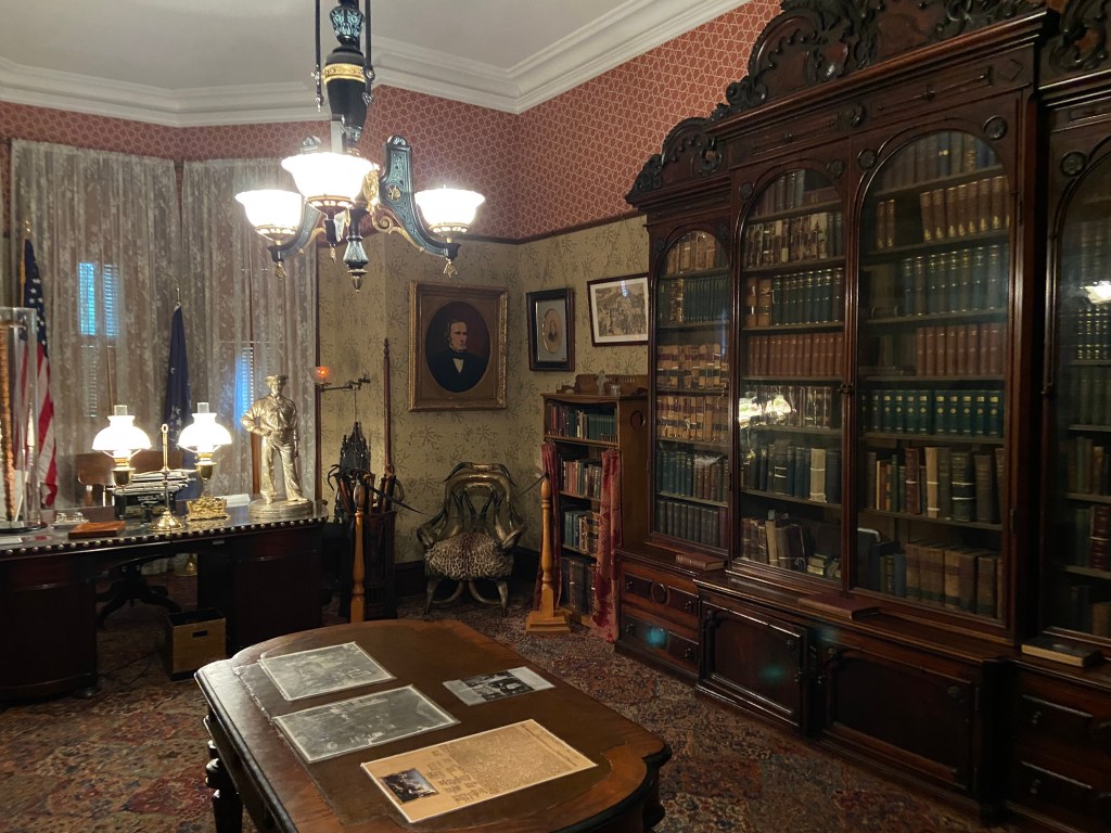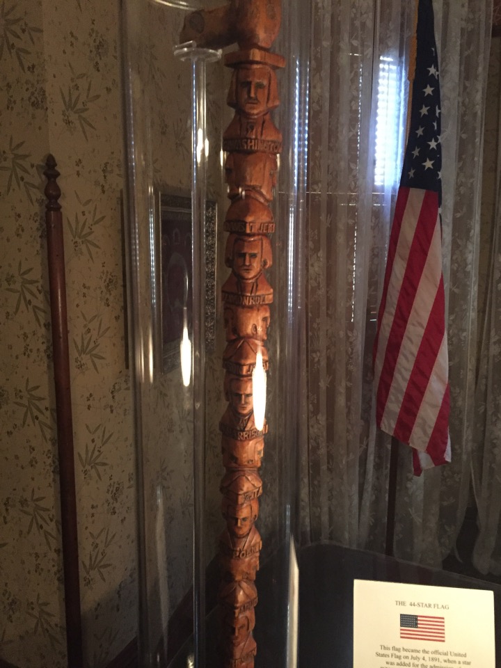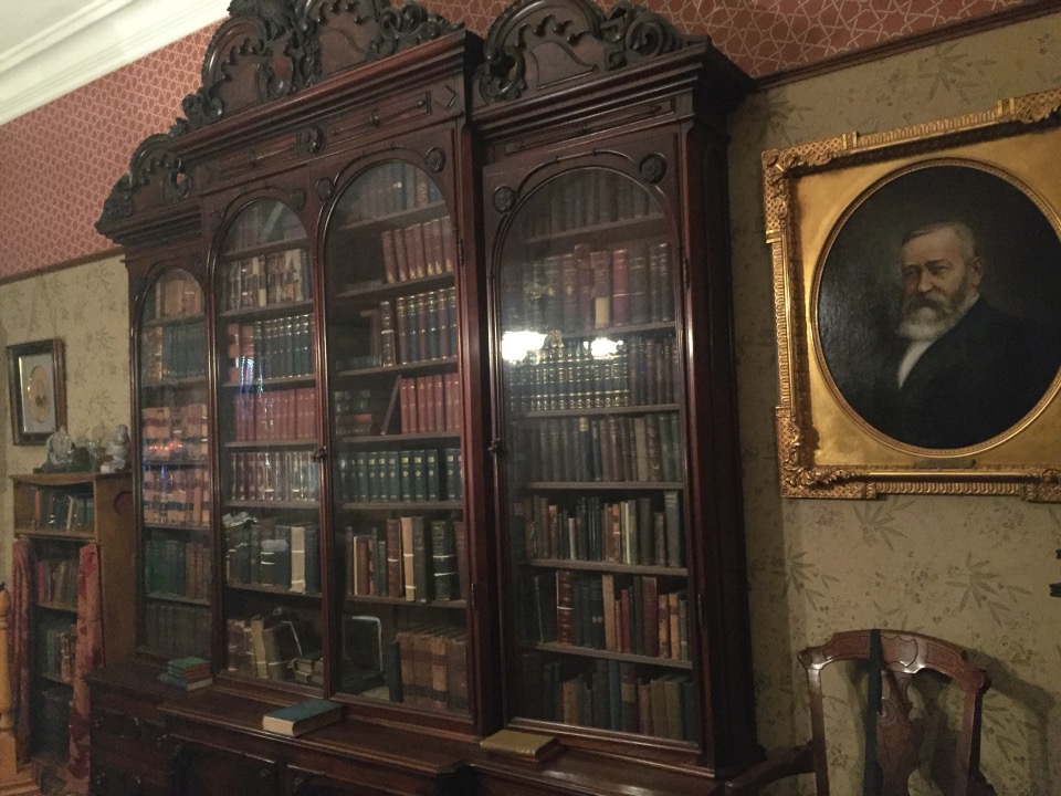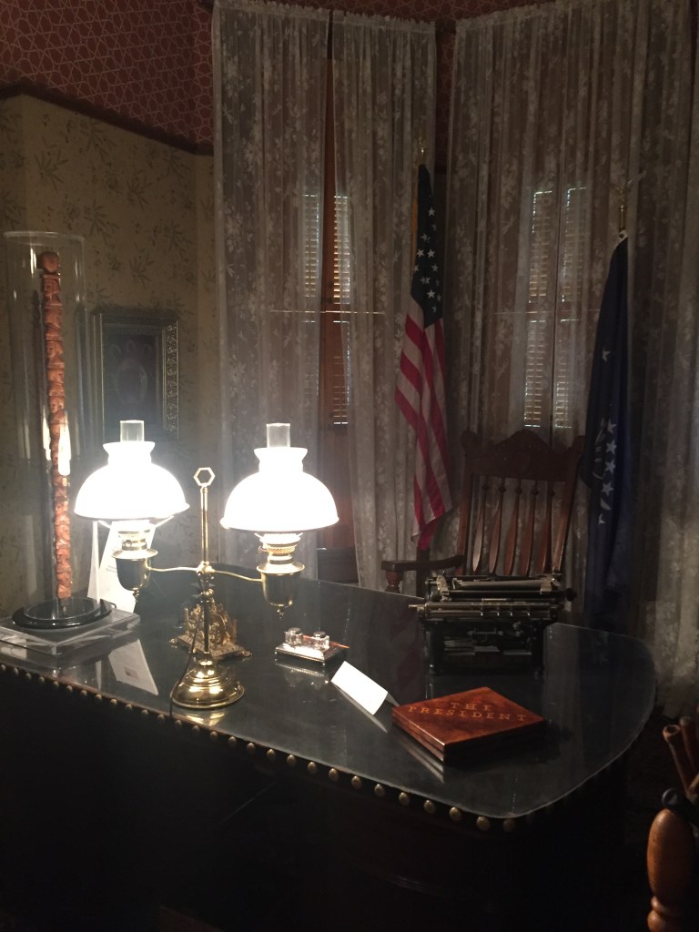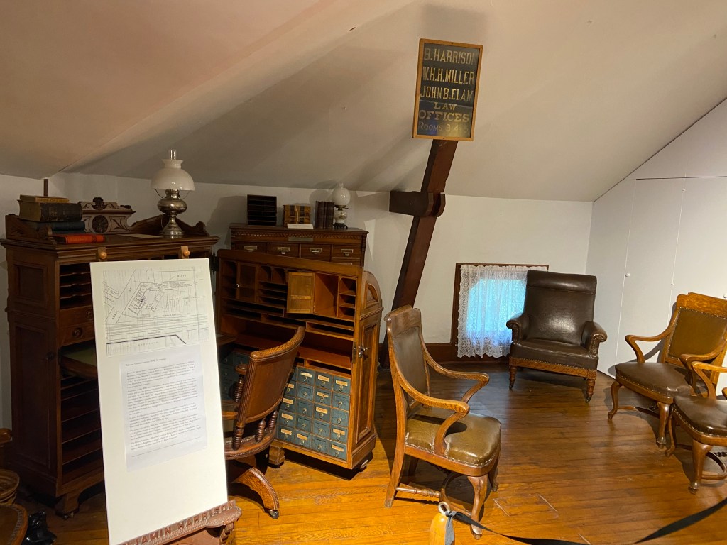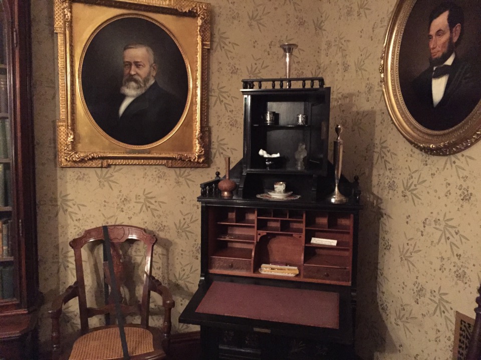Benjamin Harrison Home Heading in Front Parlor Wall in Library Benjamin’s own booksThe Cane! Benjamin and his secretary Dining Room China Harrison cribs Bedroom quilt Washington to Harrison, Centennial President