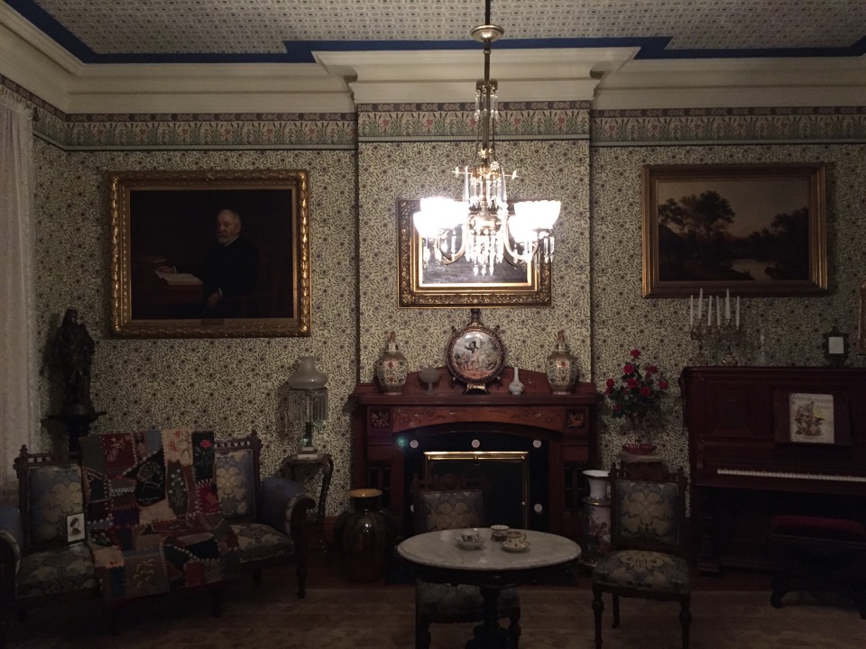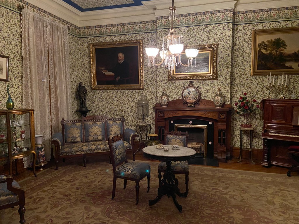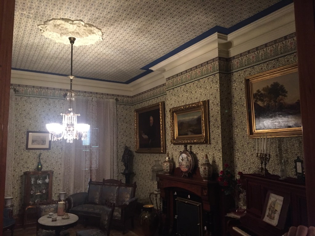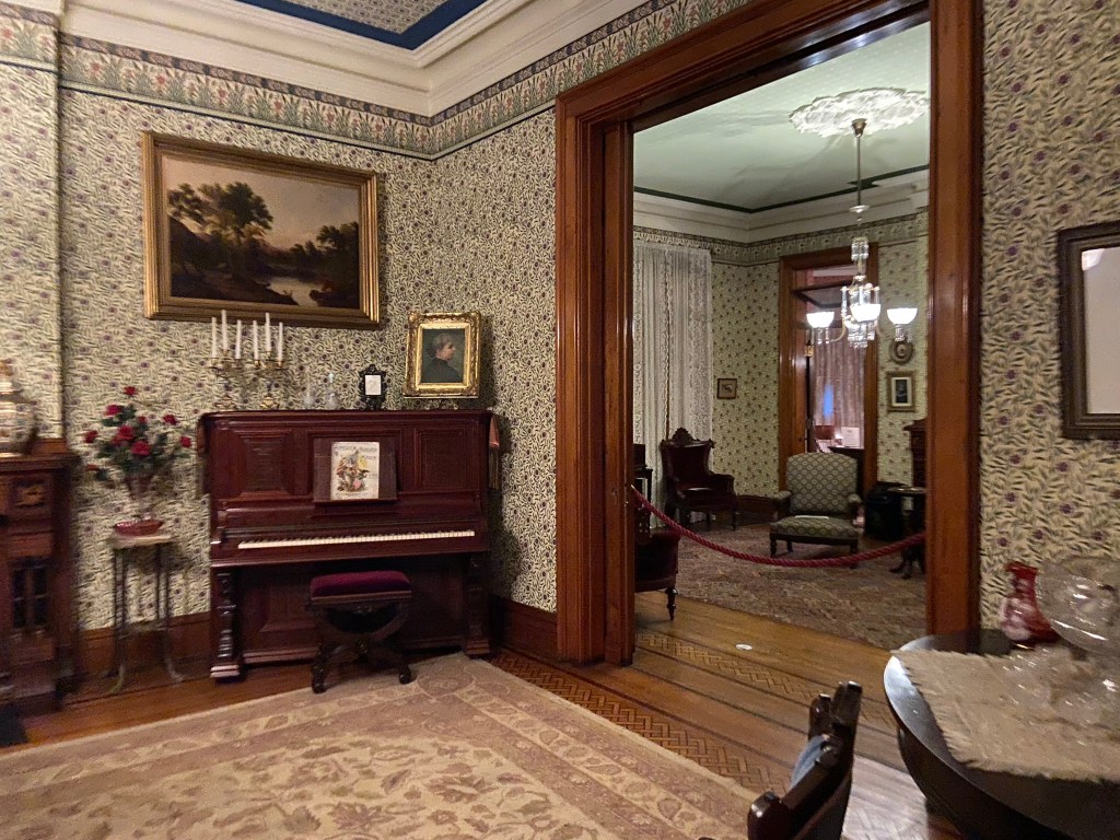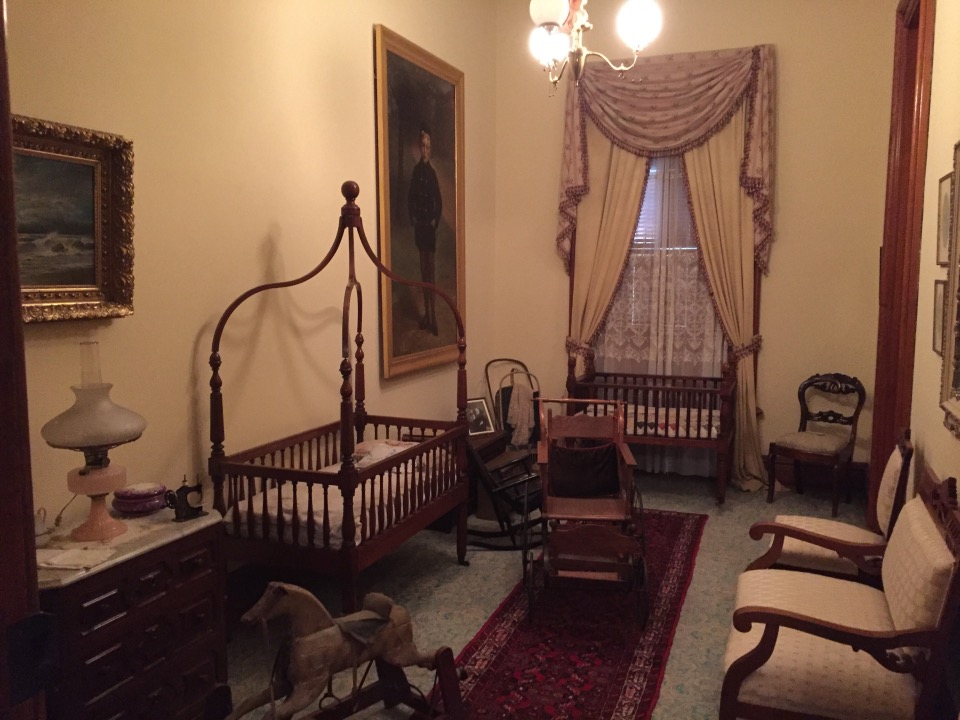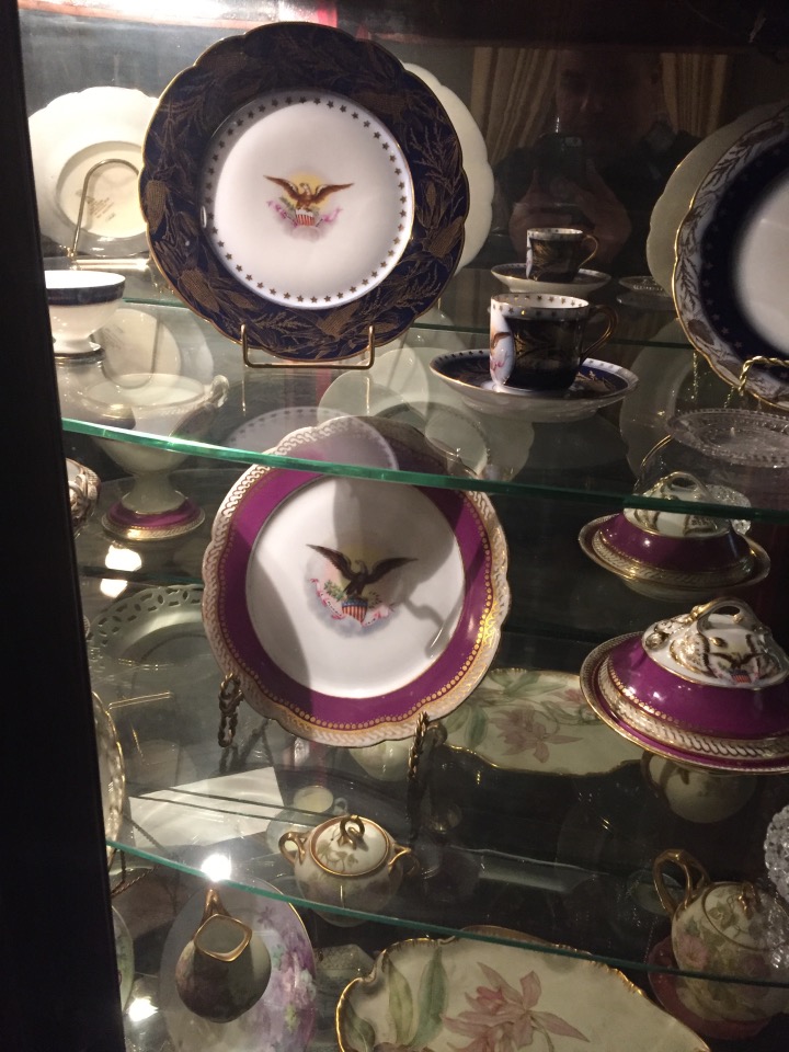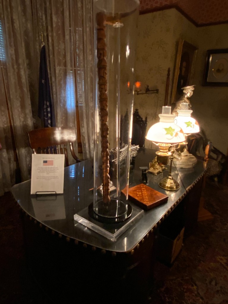 Benjamin Harrison Home Heading in Front Parlor Wall in Library Benjamin’s own booksThe Cane! Benjamin and his secretary Dining Room China Harrison cribs Bedroom quilt Washington to Harrison, Centennial President
