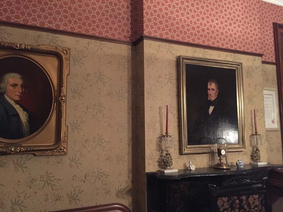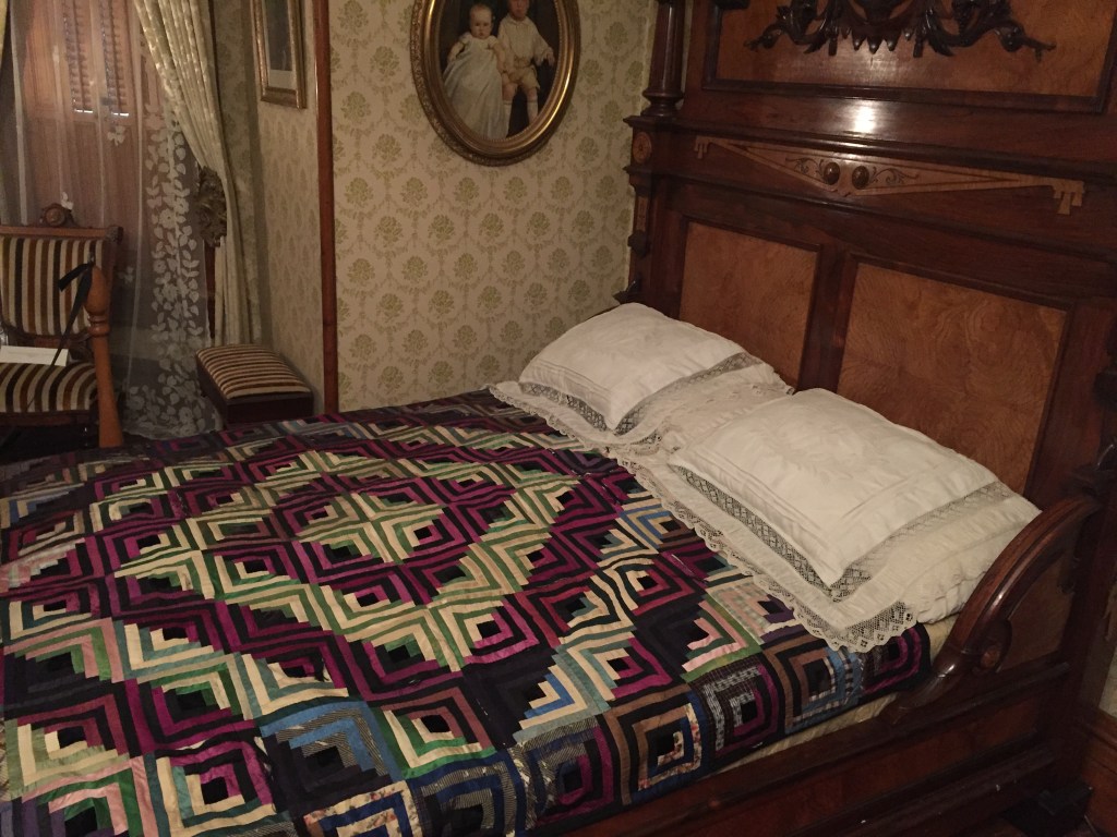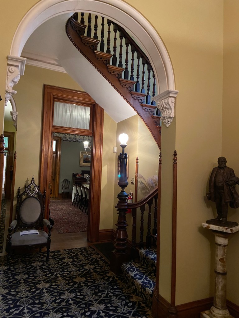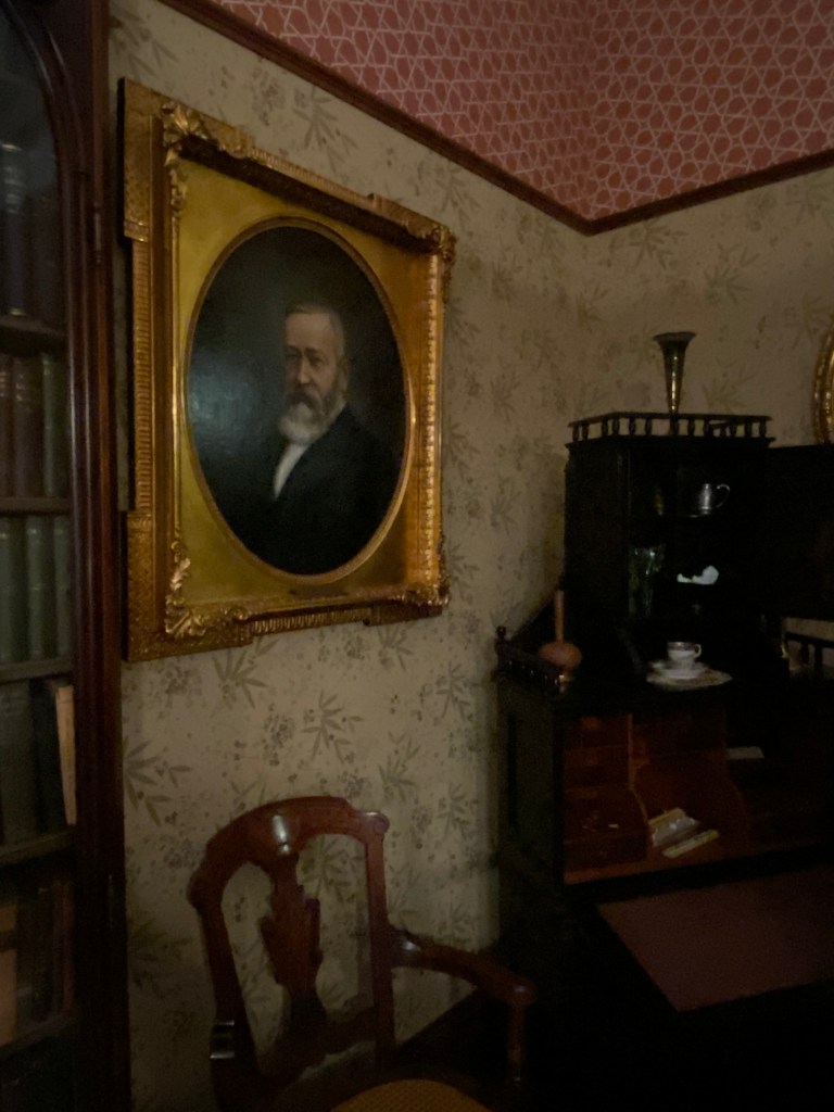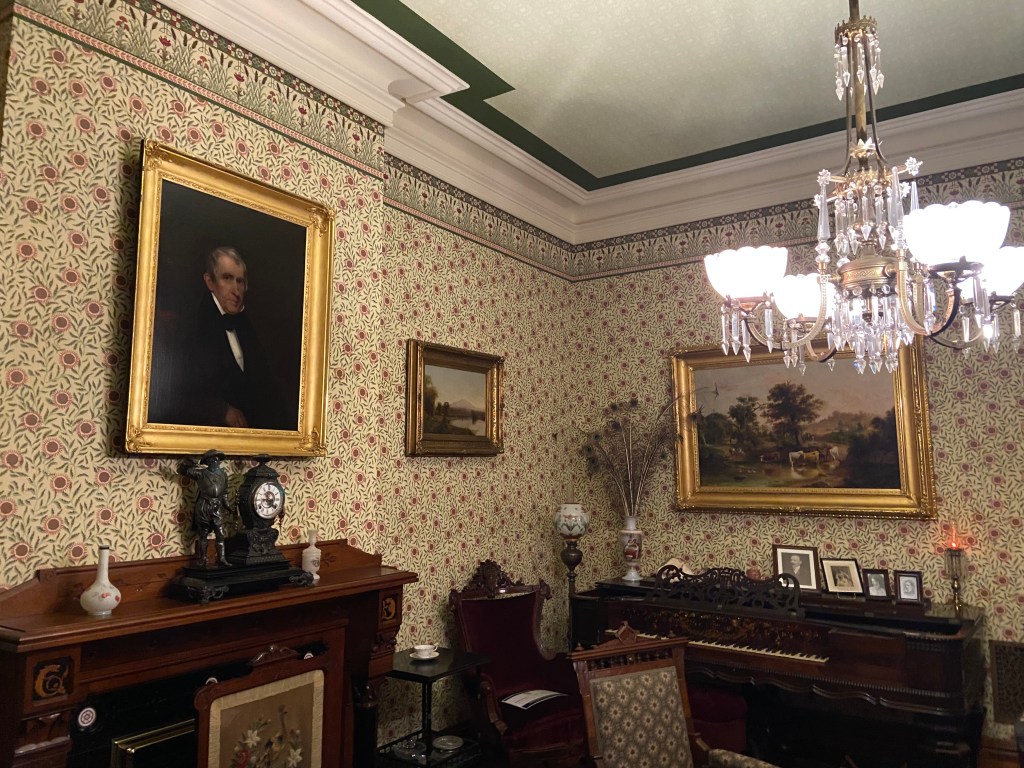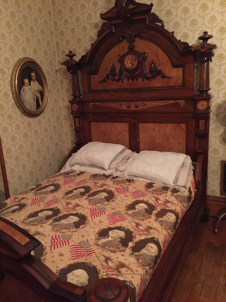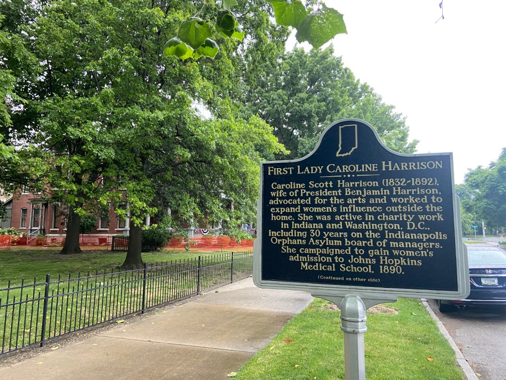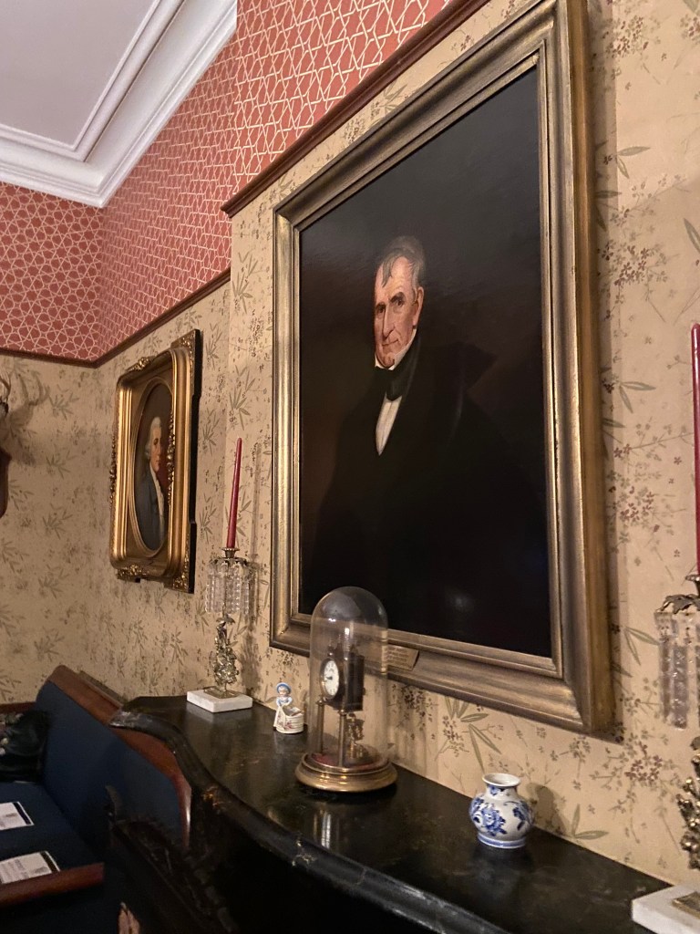 Benjamin Harrison’s home Marker for First Lady Caroline HarrisonThe Harrison home all festooned Benjamin Harrison Home Front Porch Formal Parlor, with Harrison portrait Staircase and parlor Benjamin Harrison Less formal Parlor Grandfather William Henry Parlors President Benjamin Harrison Love the cane with Presidents etched in Benjamin Harrison V and William Henry in the Library Benjamin Harrison’s desk and effects Benjamin’s bookcase Just love his Library KitchenDining Room with official china China collection Harrison family crib Benjamin Harrison Portrait Caroline Harrison Portrait Benjamin Harrison’s bed, and where he died. Birthplace in North Bend Attic, pre-renovation.