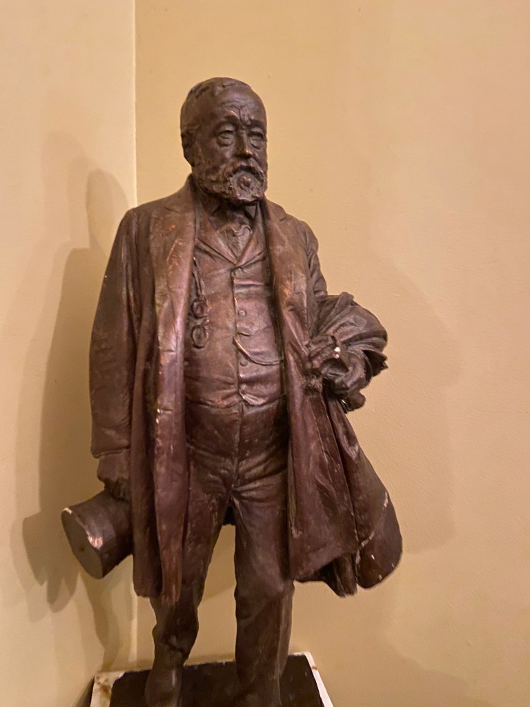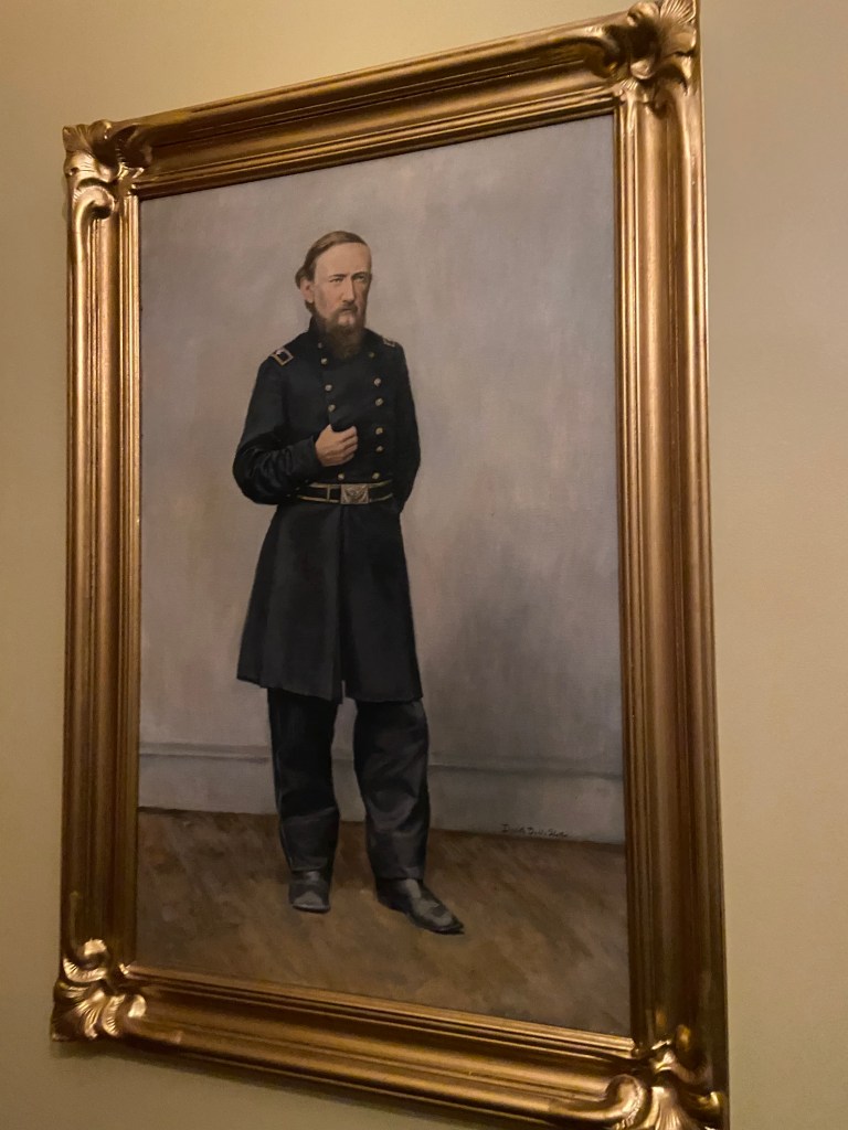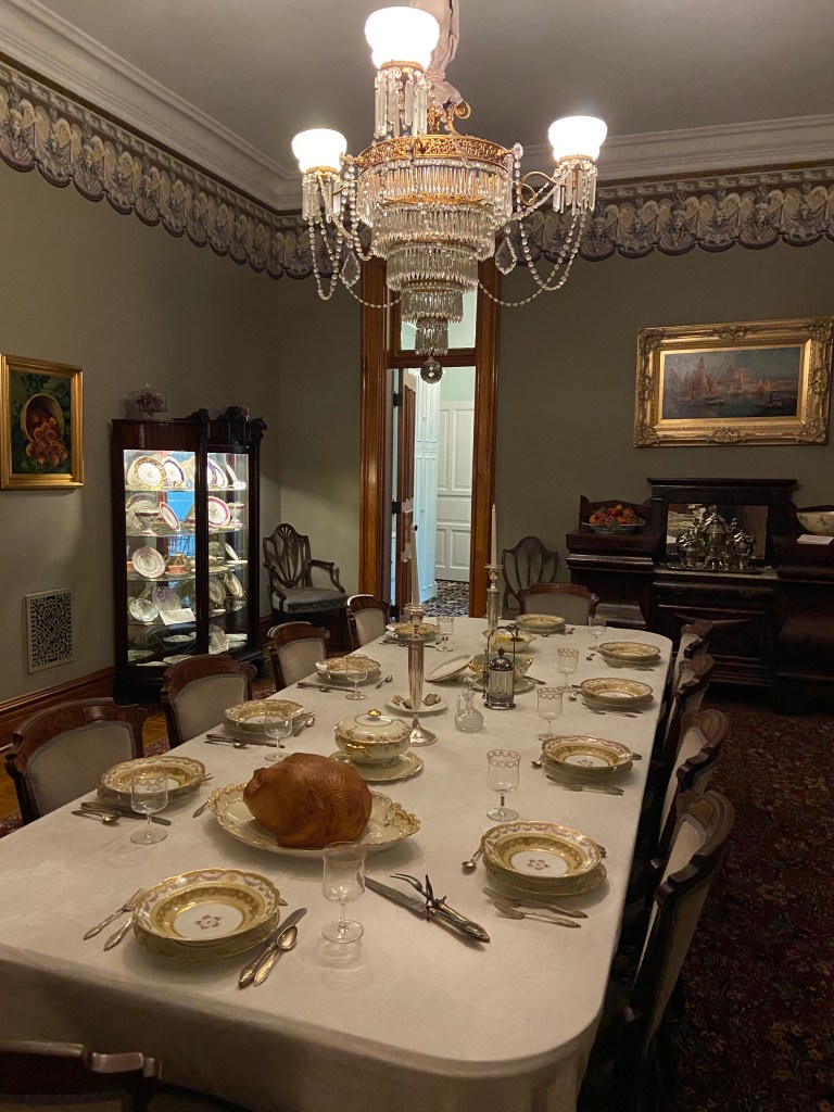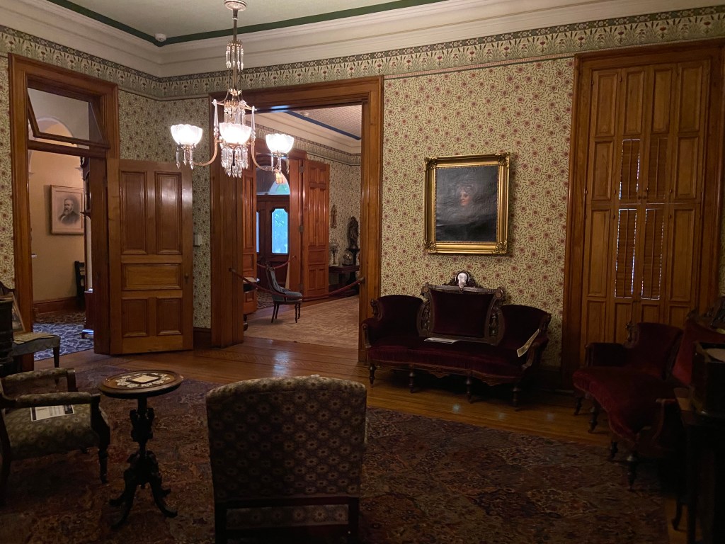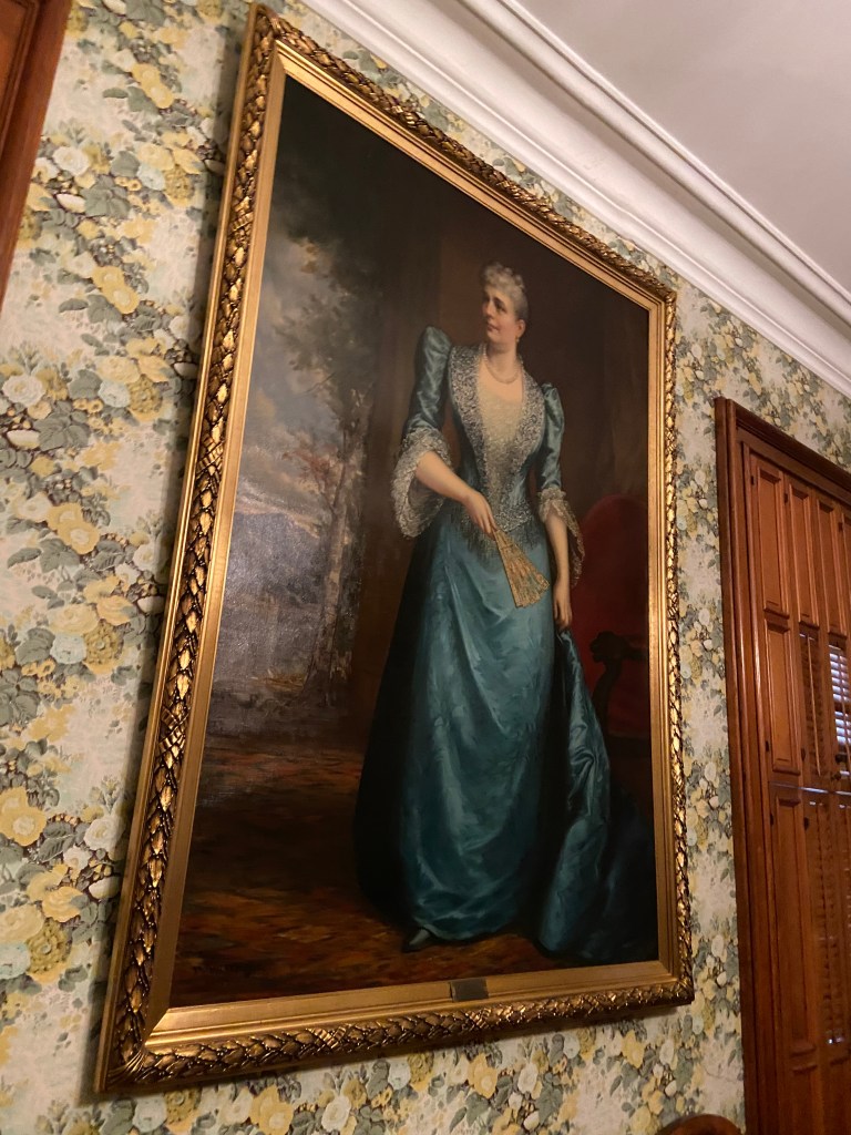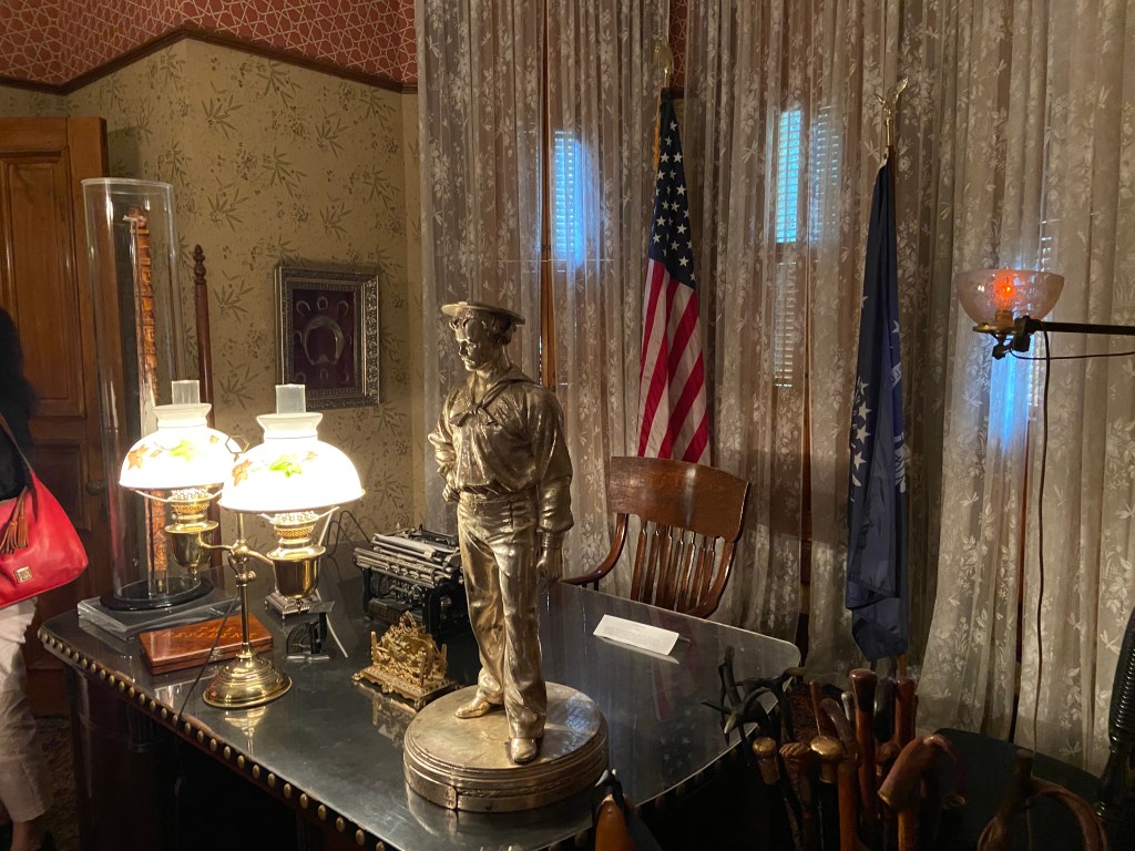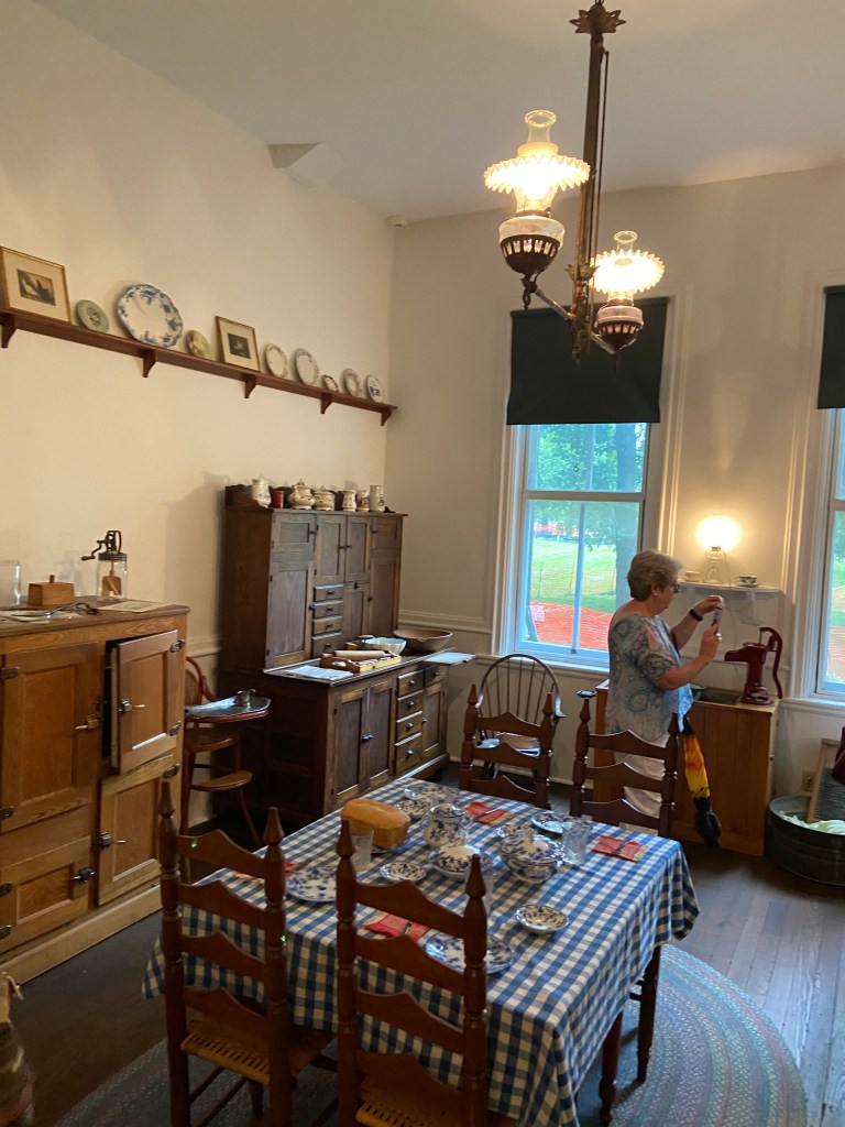 Benjamin Harrison’s home Marker for First Lady Caroline HarrisonThe Harrison home all festooned Benjamin Harrison Home Front Porch Formal Parlor, with Harrison portrait Staircase and parlor Benjamin Harrison Less formal Parlor Grandfather William Henry Parlors President Benjamin Harrison Love the cane with Presidents etched in Benjamin Harrison V and William Henry in the Library Benjamin Harrison’s desk and effects Benjamin’s bookcase Just love his Library KitchenDining Room with official china China collection Harrison family crib Benjamin Harrison Portrait Caroline Harrison Portrait Benjamin Harrison’s bed, and where he died. Birthplace in North Bend Attic, pre-renovation.
