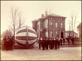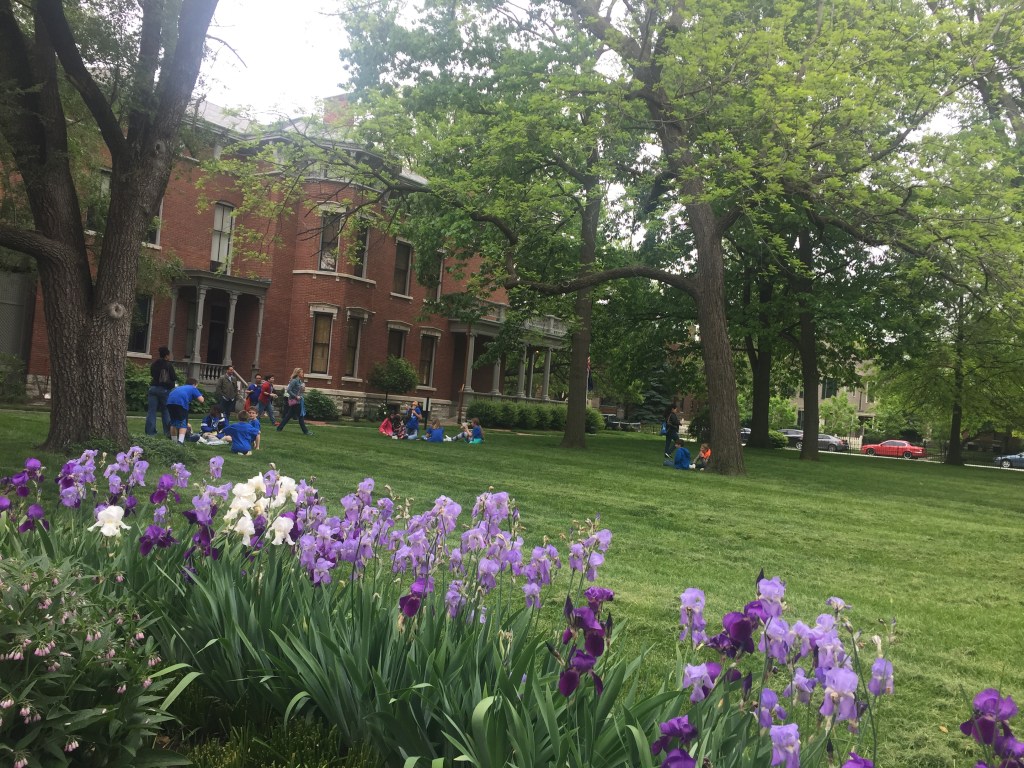 Rolling the ball in front of a porch-less Benjamin Harrison home.