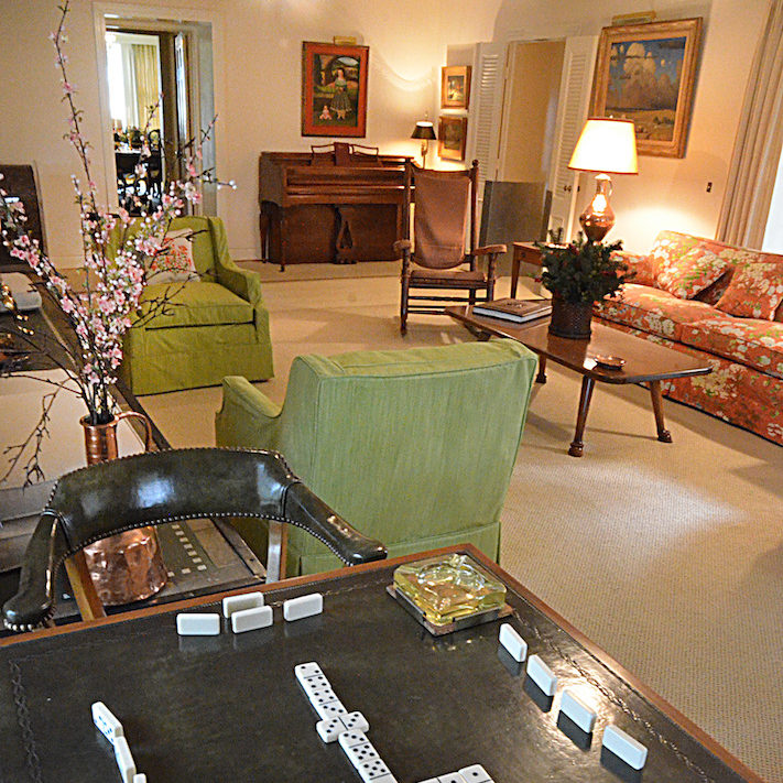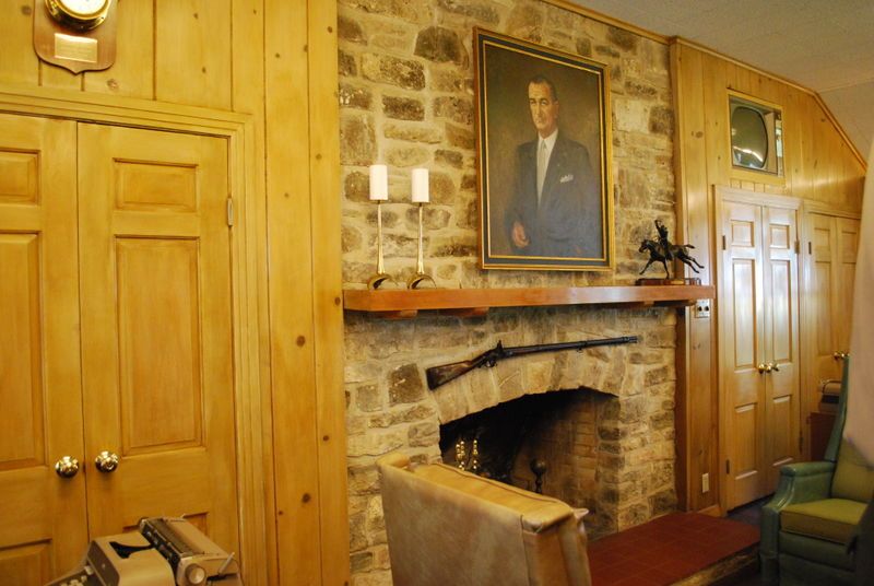 LBJ Ranch! Love this photo! Clearly love the ranch!The back areaSecurity shed From across the PedernalesLady Bird and Lyndon at their home!Lady Bird in her home, for Architectural DigestLiving Room at LBJ RanchStone wall Furnishings and wallBreakfast nook Lady Bird in bedroom Beautiful bedroom Family DenEntrance Lyndon’s office Lyndon’s portrait in his office