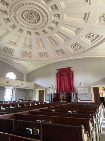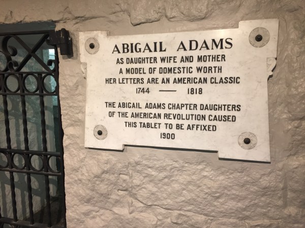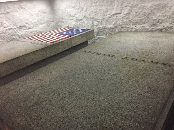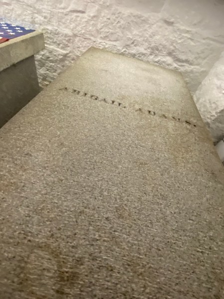 The sanctuary at United First Parish Church, the “Church of the Presidents”John and Abigail Adams’ epitaph in the sanctuaryIn the cryptJohn Adams and the grille gate to the cryptAbigail AdamsIn the tight crypt locationJohn and Abigail Adams resting side-by-sideJohn Adams’ granite tomb