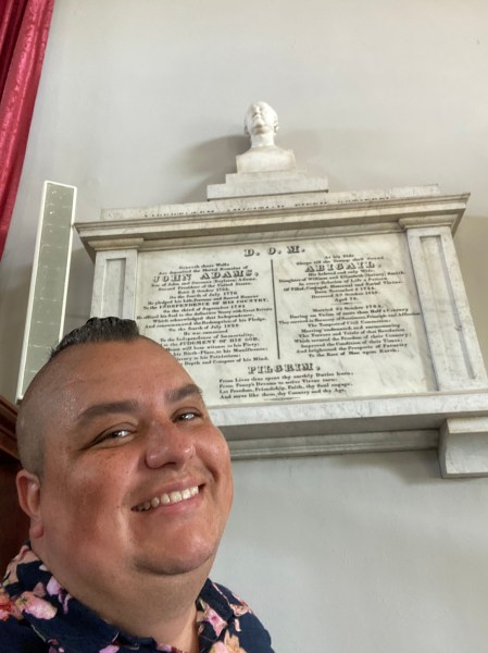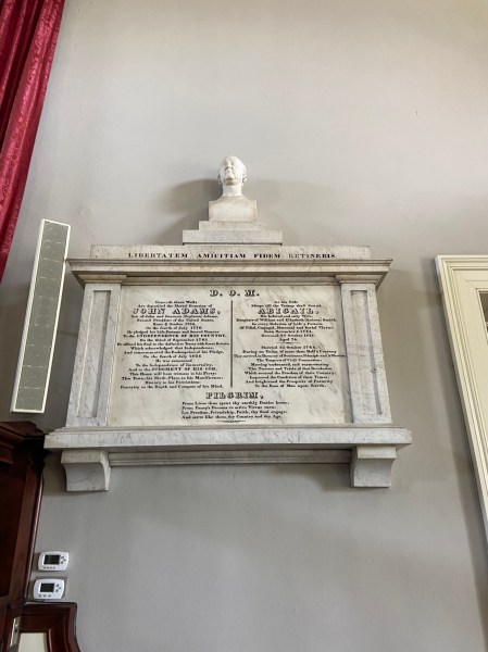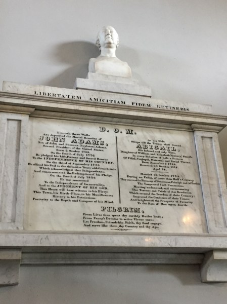United First Parish Church, the “Church of the Presidents” With the signThe stunning sanctuaryThe epitaph in the sanctuary With John AdamsIn the basement, the marker for John Adams and the gate to the cryptLooking in the cryptWith John Adams’ graveJohn AdamsAbigail Adams’ graveWith the four graves in the cryptJohn Adams’ marker and entranceJohn and me Abigail’s markerRelics in the basementFrom the church ledger More itemsModel of the older churchIn the crypt with the markers behindMarker at the church entrance