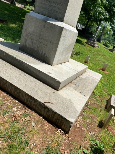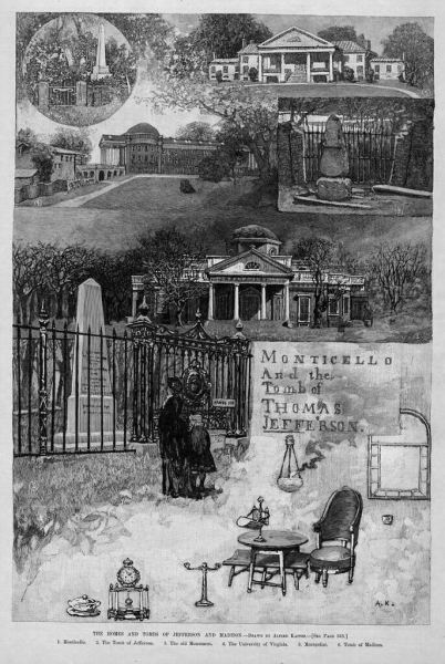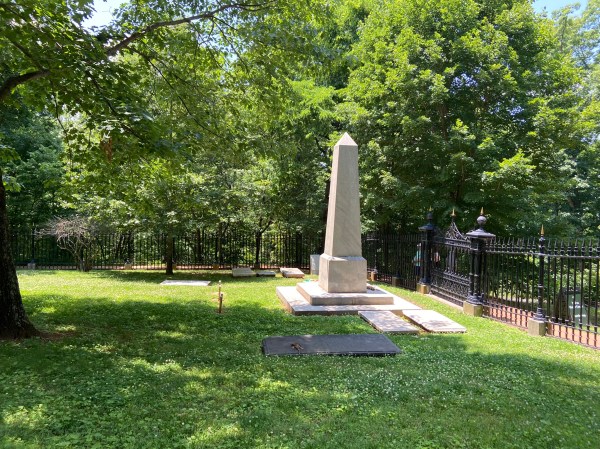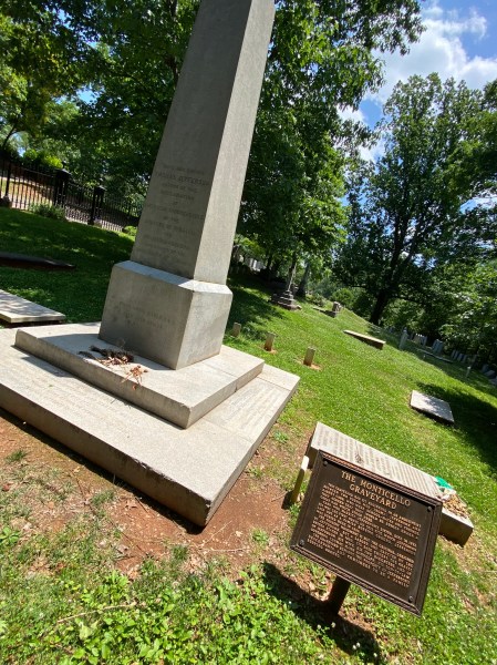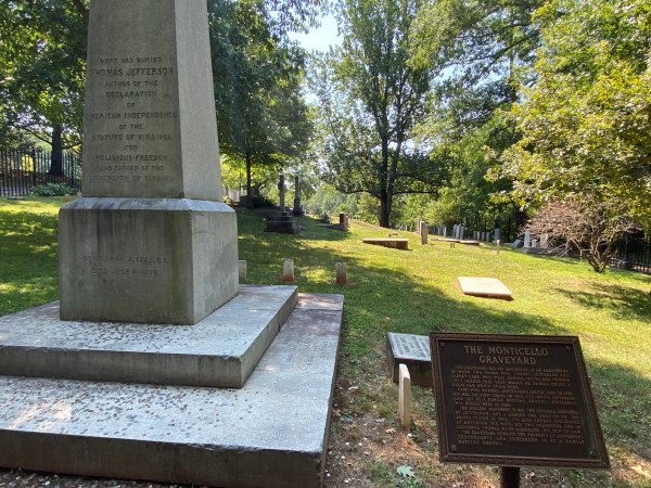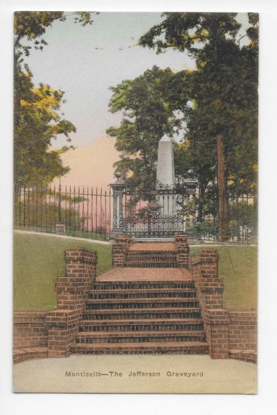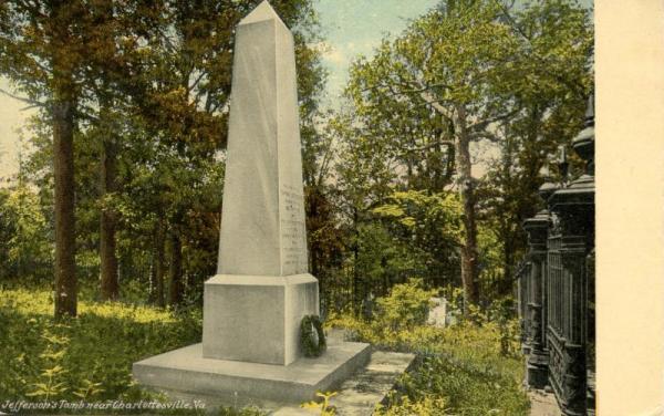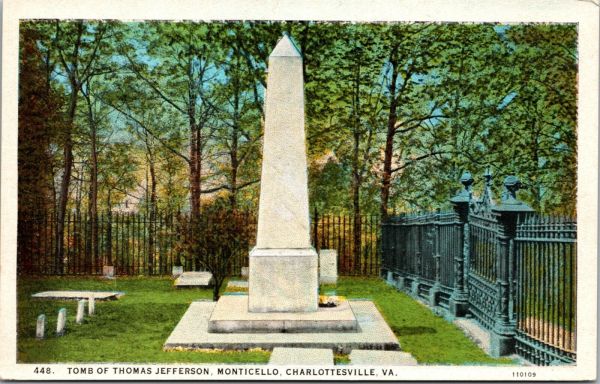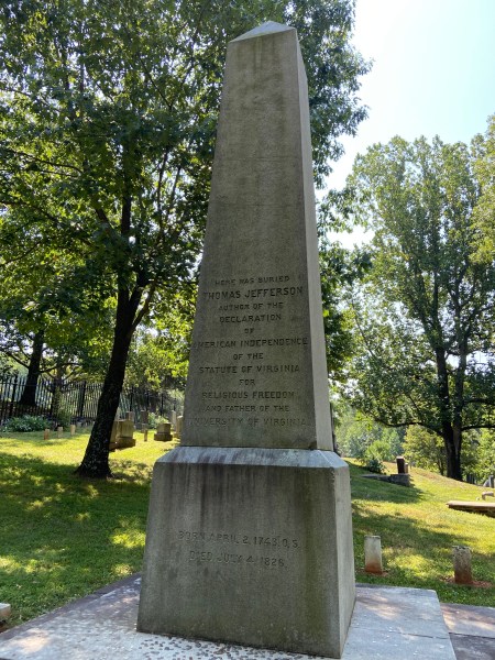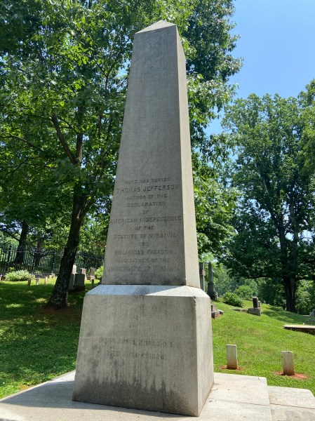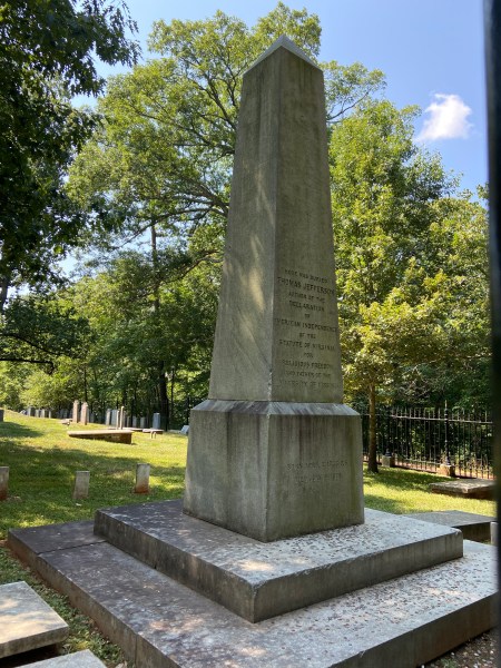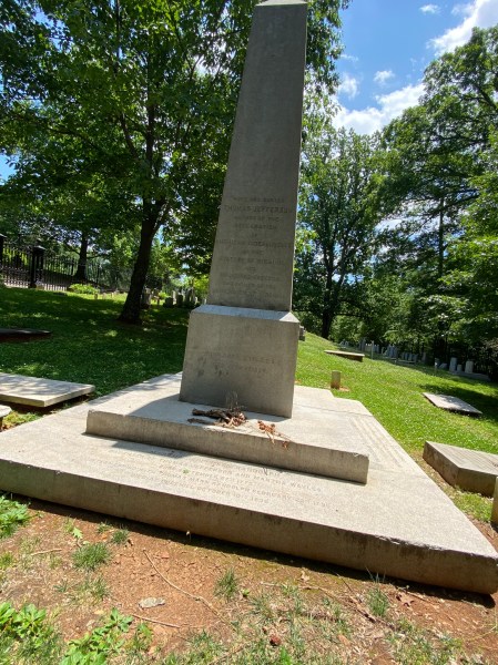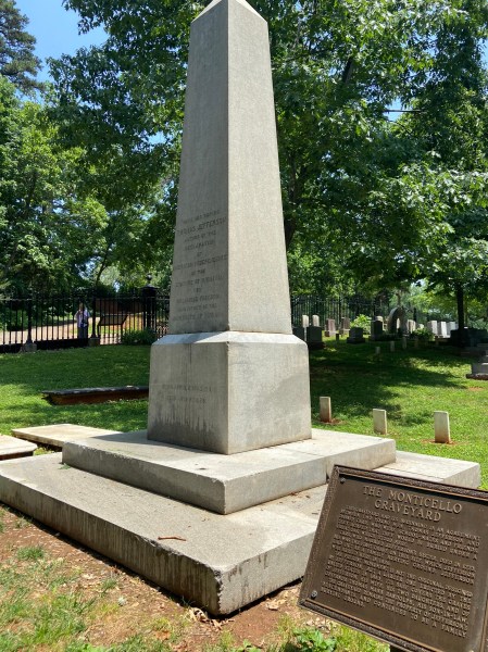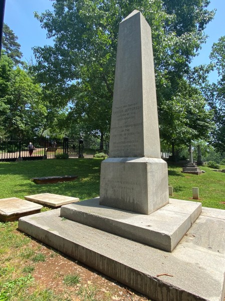 The memorial obelisk with gateThomas Jefferson gravesiteThe obelisk for Thomas Jefferson, with family buried around him.Marker beside Jefferson gravesite listing the notable burialsJefferson gravesite from path to Monticello mansion.