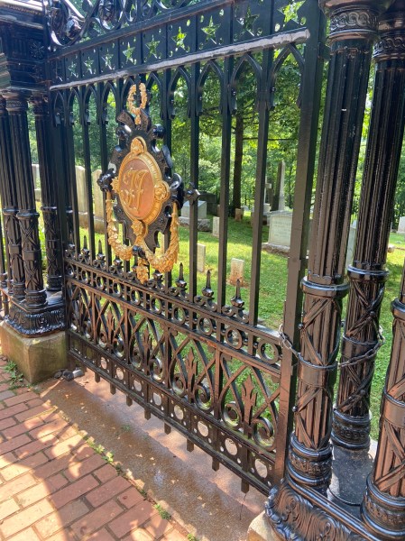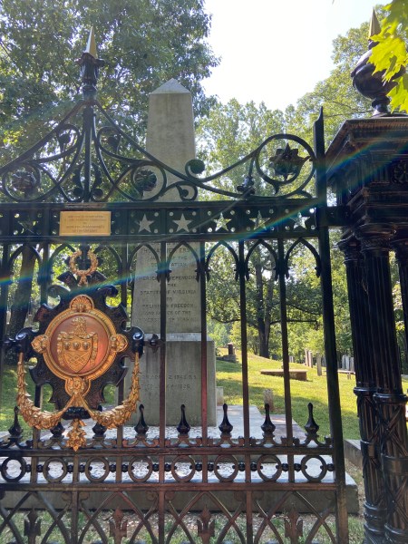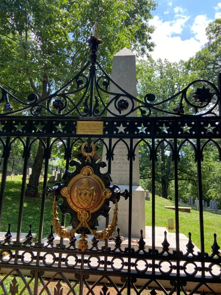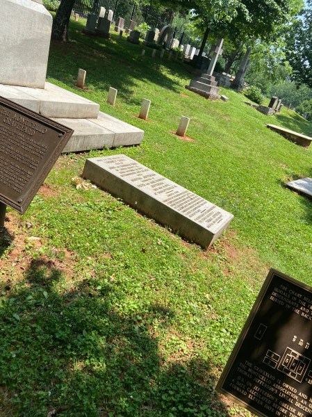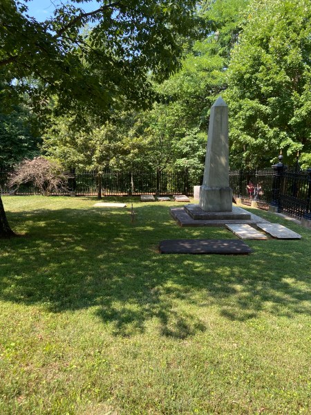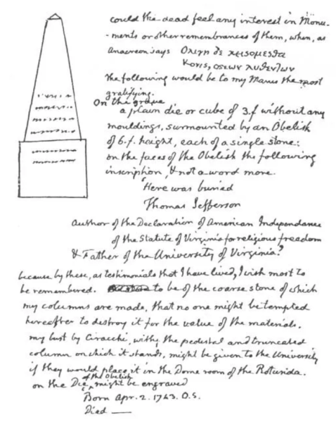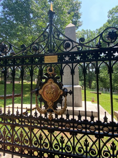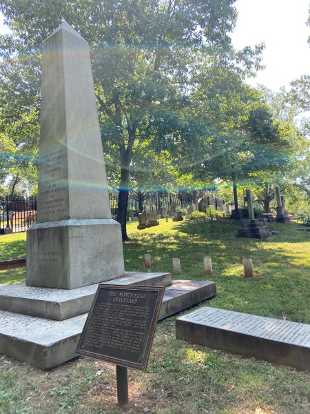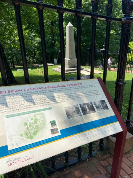 Monticello cemetery fenceWaysign next to Cemetery with the obelisk Thomas Jefferson graveThomas Jefferson obeliskMarkers for Jefferson’s daughter and wife at the baseDabney Carr’s graveText from the obeliskFrom beyond the fenceThomas Jefferson gravesite