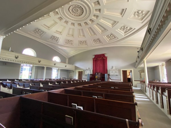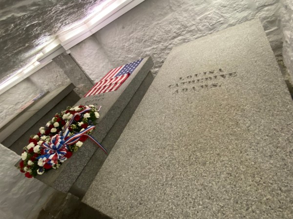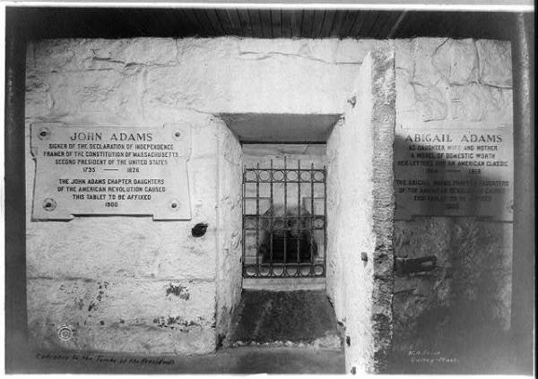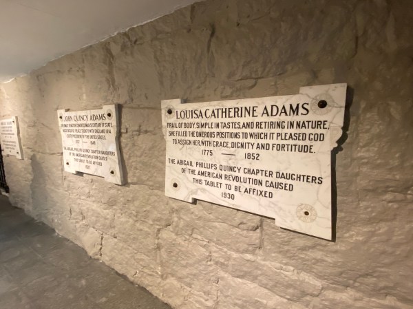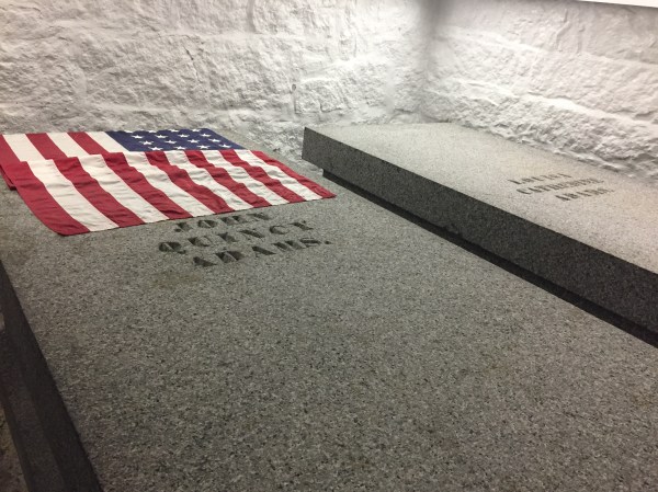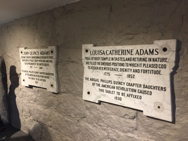 In the sanctuary at United First Parish ChurchJohn Quincy Adams and Louisa Adams’ tablet in the sanctuaryIn the crypt John Quincy Adams and Louisa Adams in the cryptMarkers erected by the Daughters of the American Revolution