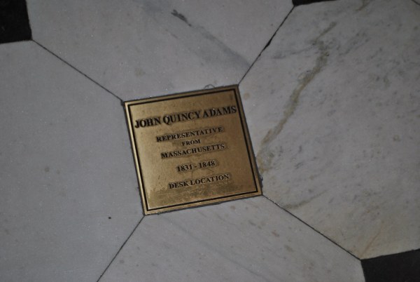 Marker of John Quincy Adams’ desk in Statuary Hall, and where he collapsed.