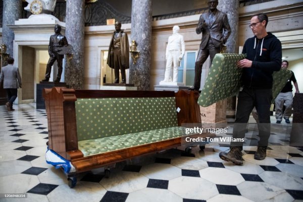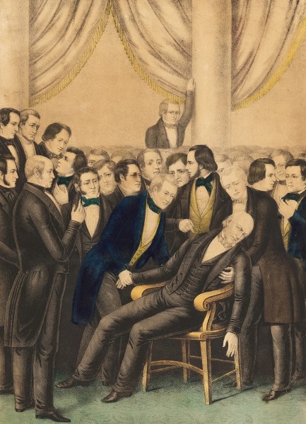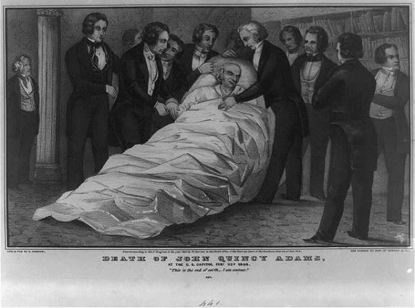 The room where John Quincy Adams died in 1848, now the Lindy Claiborne Boggs Congressional Women’s Reading Room.The sofa that Rep. John Quincy Adams died on in 1848, packed for storage in Statuary Hall outside of the Lindy Claiborne Boggs Congressional Women’s Reading Room.John Quincy Adams’ collapse and death, from the National Portrait Gallery and Library of Congress.