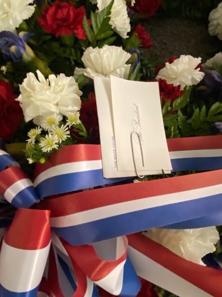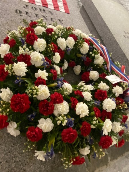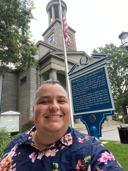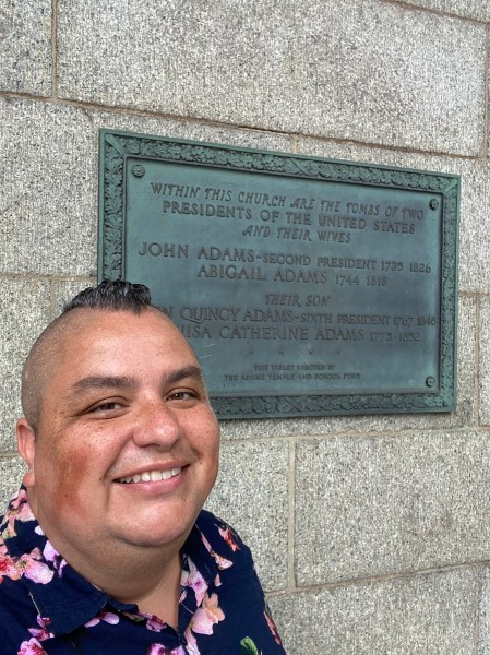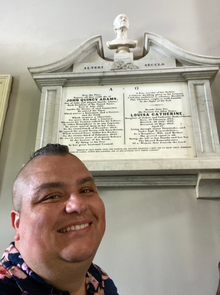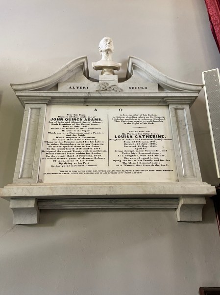 Church of the Presidents! United First Parish Church! With the marker! In the sanctuary John Quincy Adams’ epitaph in the sanctuary With John Quincy Adams’ markerJohn Quincy and Louisa’s sarcophagi John Quincy Adams’ floral wreathCard from President BidenJohn Quincy AdamsJohn Quincy and Louisa The two Presidents and two First Ladies With the four makers in the cryptJohn Quincy and Louisa’s markers outside the cryptWith the tablet on the outside of the church