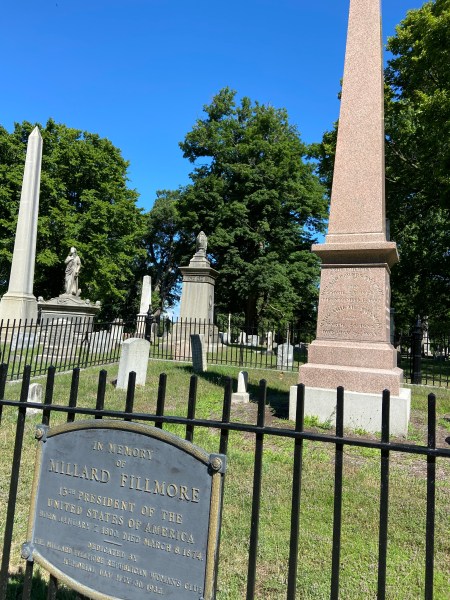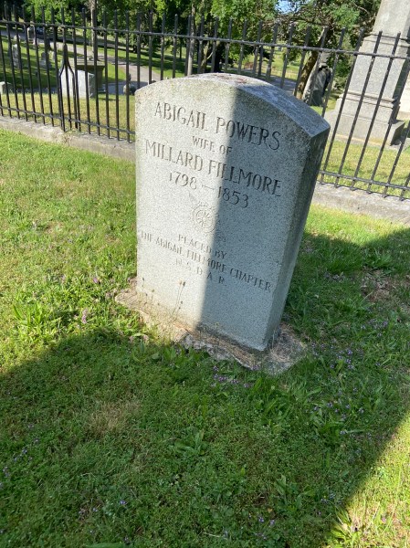 Millard Fillmore gravesiteMarkers for Caroline and MillardOutside the fenceWith the obeliskAbigail’s gravestoneWith Millard’s epitaphMillard’s epitaph and basePicturesque settingMillard Fillmore gravesite