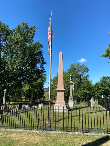 At the Millard Fillmore gravesiteBeyond the gateFlag blowing The obelisk and smaller markersFacing the children’s epitaphMarkers and obeliskWith the Fillmore obelisk From down the hillFacing Millard’s front