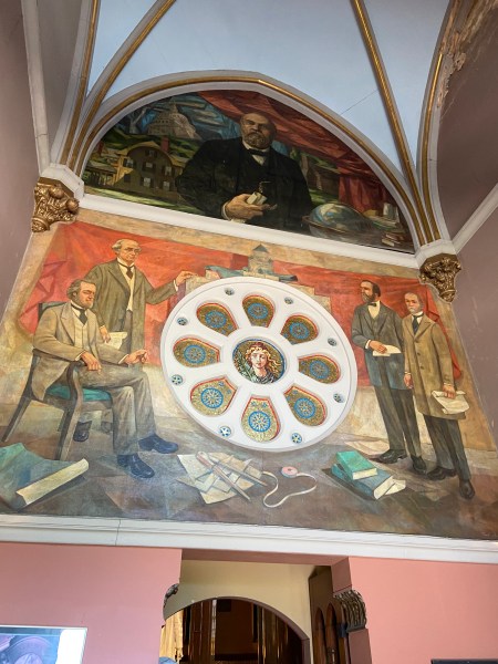 The James Garfield MemorialCleaned and landscapedHeading upThe entrance The freshly cleaned panels Inside the hallUnder the rotundaGorgeous settingJames GarfieldOhio, holding his birthplace log cabinThe rotundaThe statue