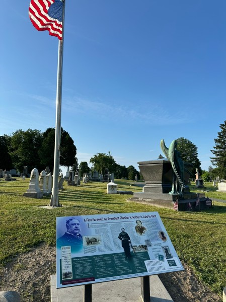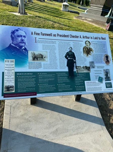 Chester Arthur gravesiteLandscaping around the TombEllen Arthur’s tombOther side of Ellen’s tombstoneNew wayside marker at siteClose up of wayside marker Chester Arthur’s gravesite