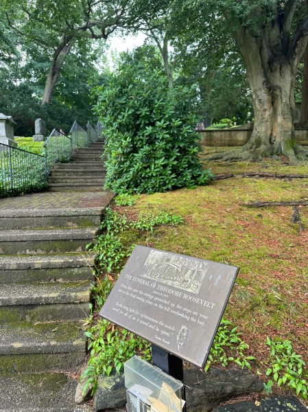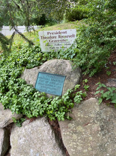 Theodore Roosevelt gravesite!Pointing to the gravesiteEntrance to Youngs CemeteryOpposite the graveThrough the fencingThe view from the gravesite, looking at the bay