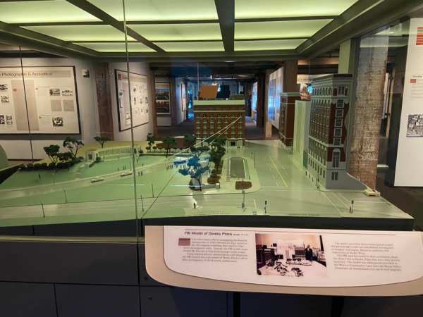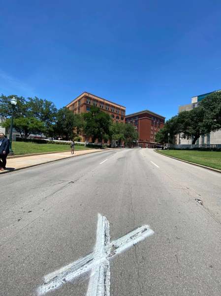 The Texas Book Depository from the street Where Lee Harvey Oswald shot at John F KennedyModel of the assassinationX marks the spotWhere Abraham Zapruder was filming